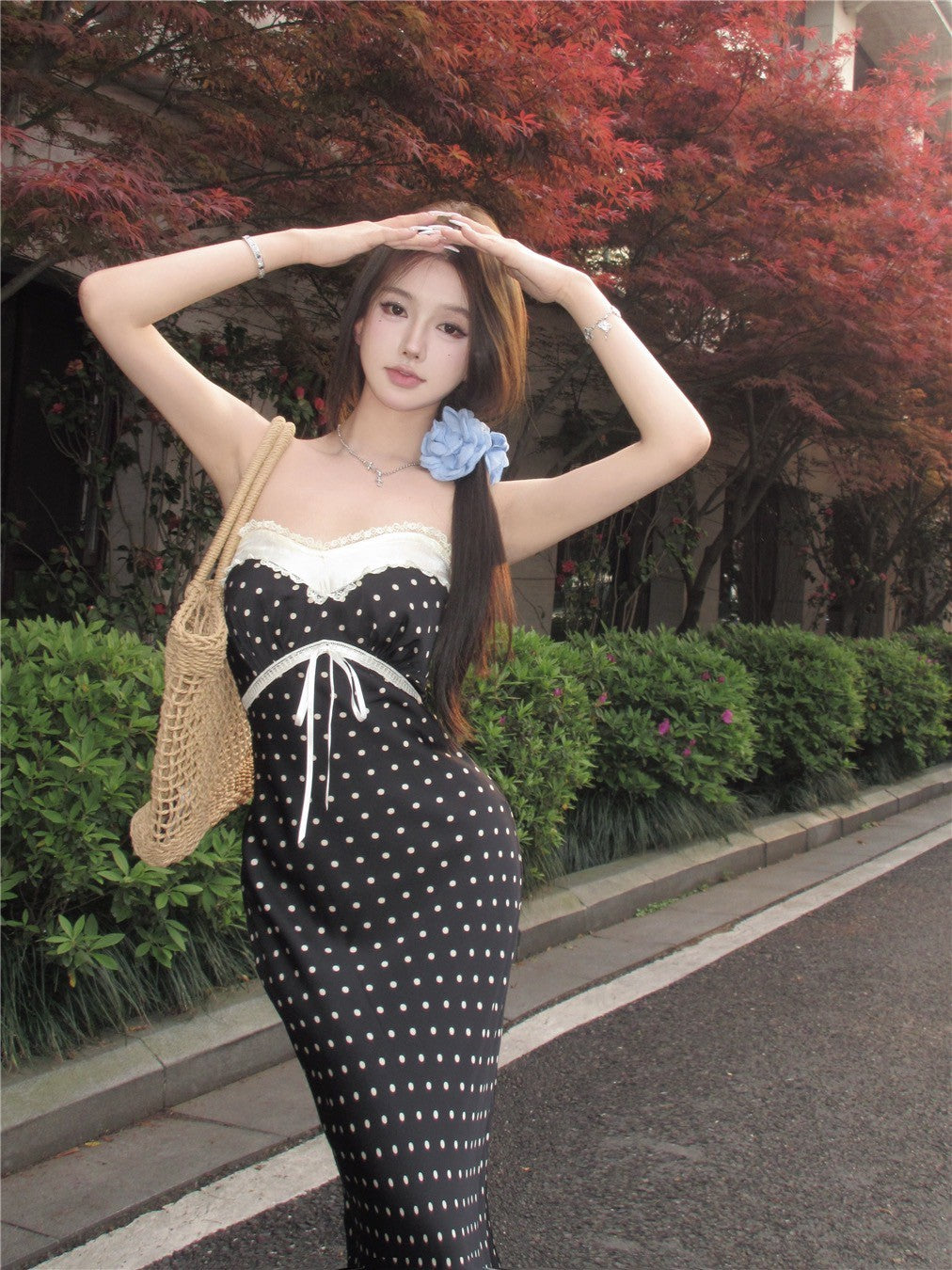 Na+ 溫柔甜心 波點撞色蝴蝶結抹胸連身裙