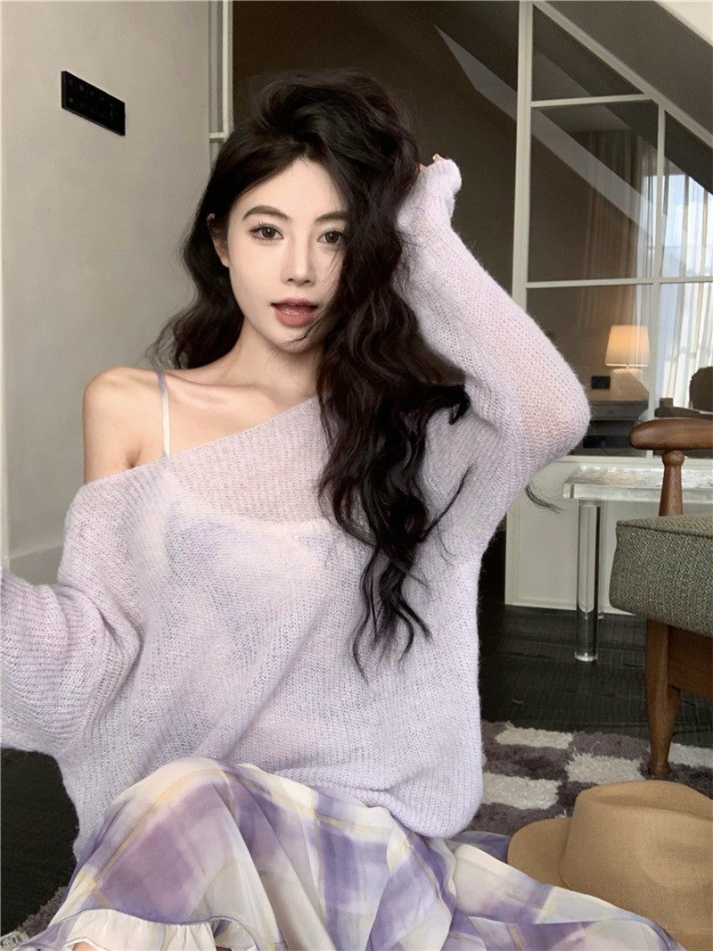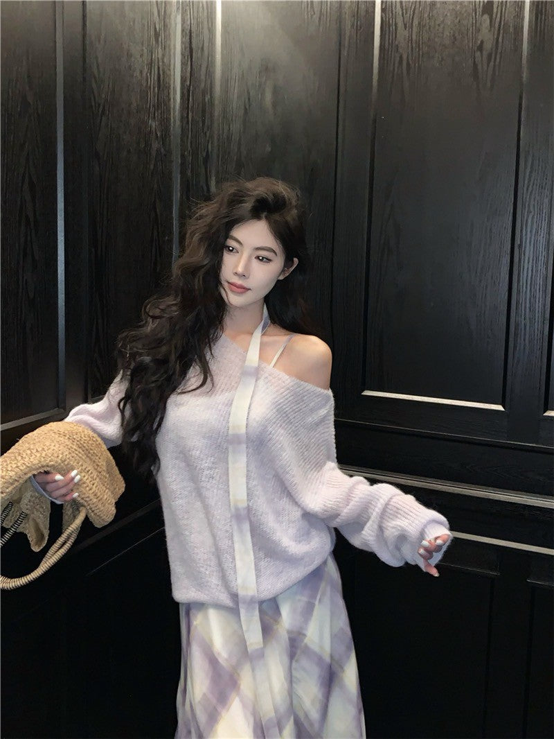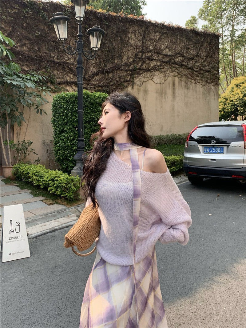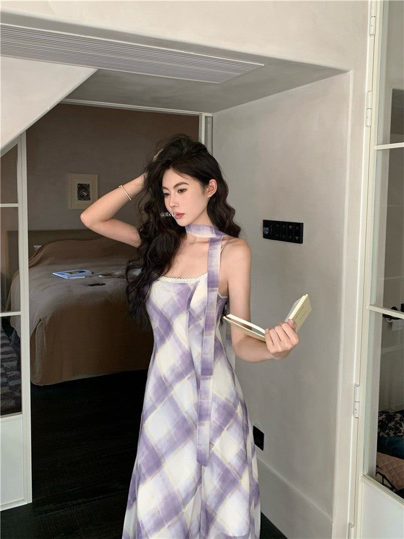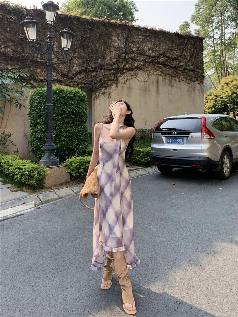 Na+ 溫柔紫調 復古格紋不規則裙擺連身裙 疊穿罩衫