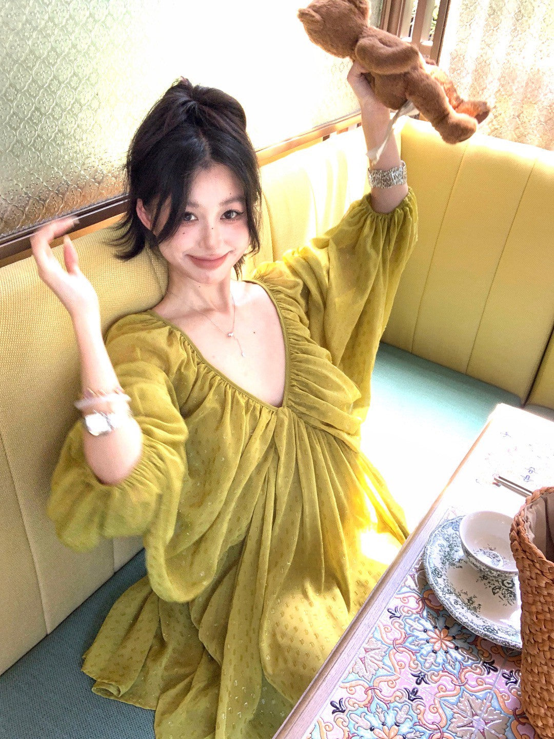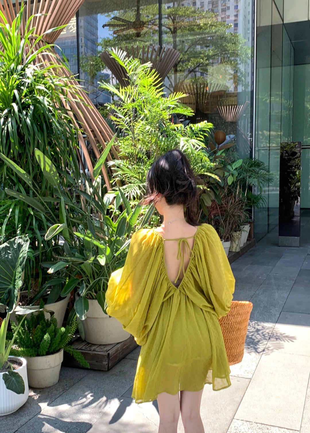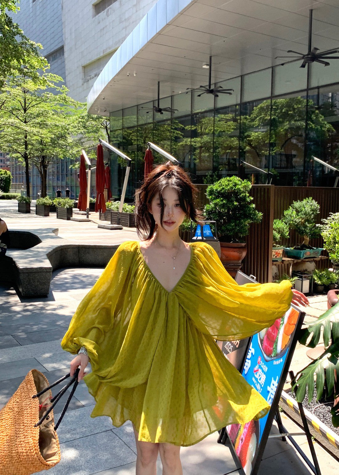 NA+ 漫步仙子渡假V擺雪紡燈籠袖上衣