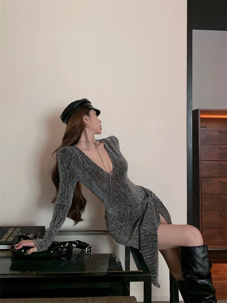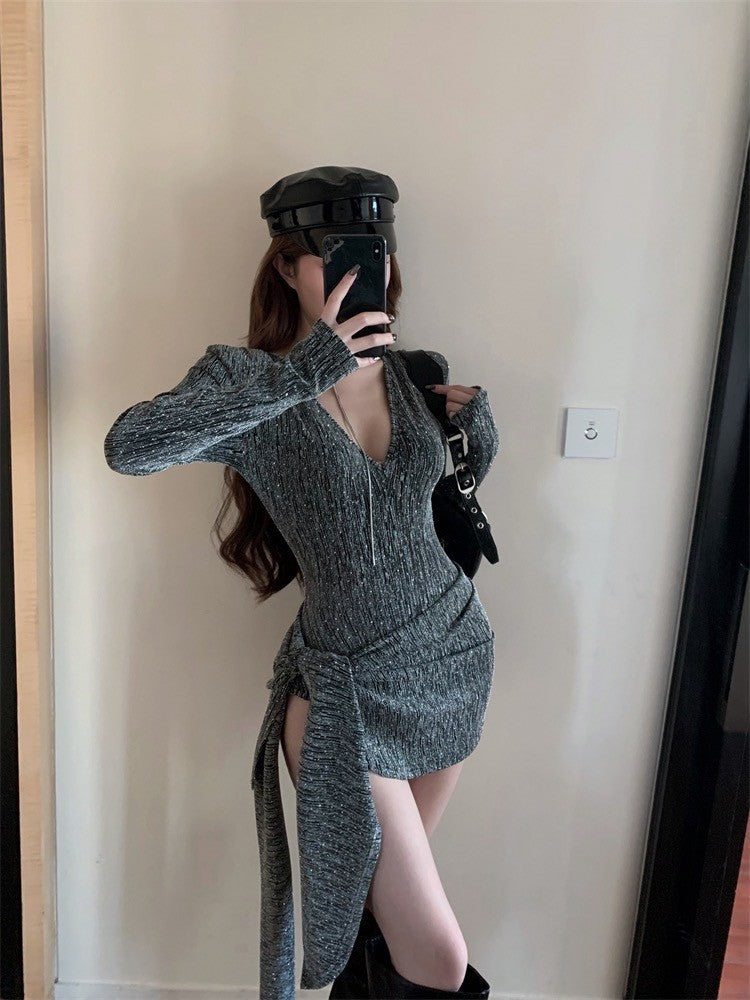 ''Na+''焦點目光 辣妹細閃紗編織V領飄帶連身裙 銀/黑