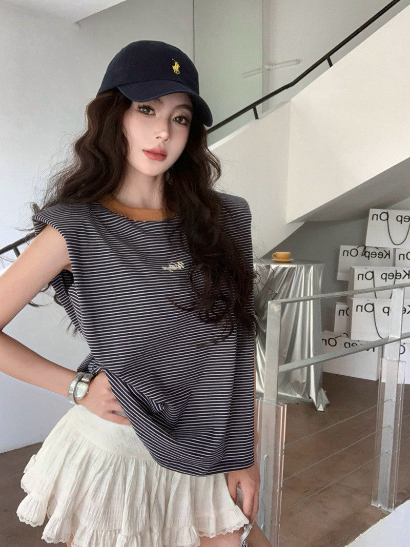 NA+ 熱愛復古味~高智感坎肩條紋上衣 深藍/咖