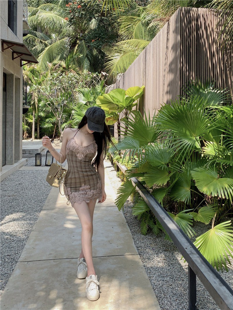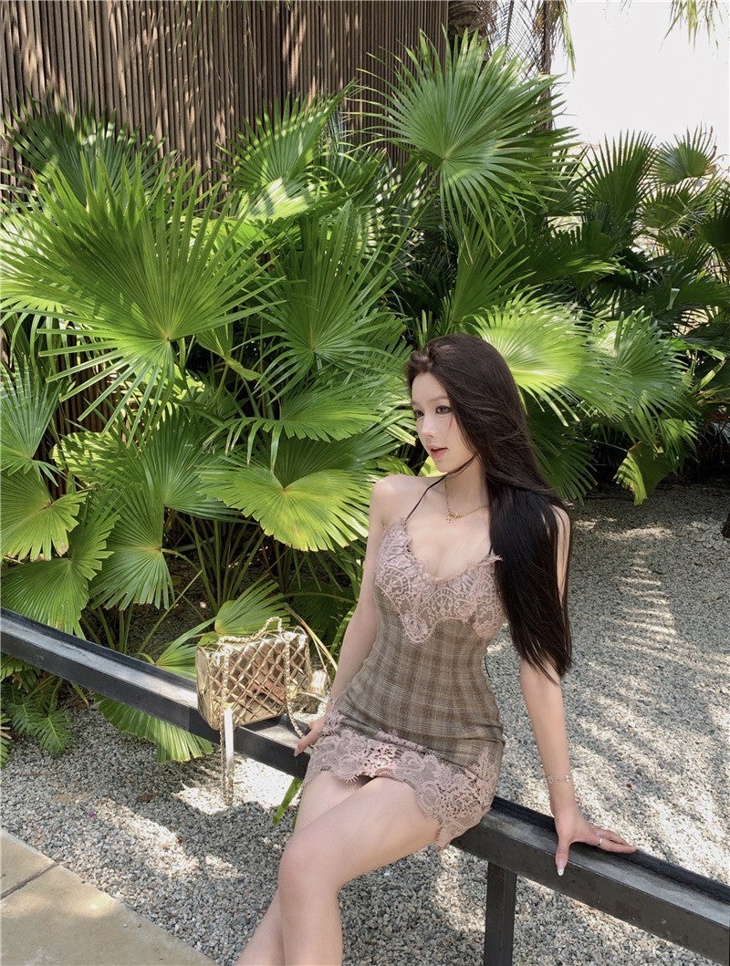 Na+ 玩惡女孩 酷甜蕾絲拼接粉格紋連身裙
