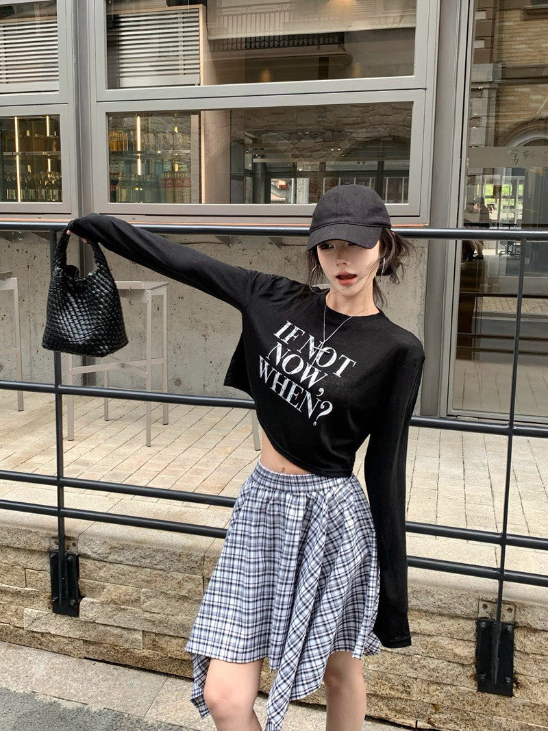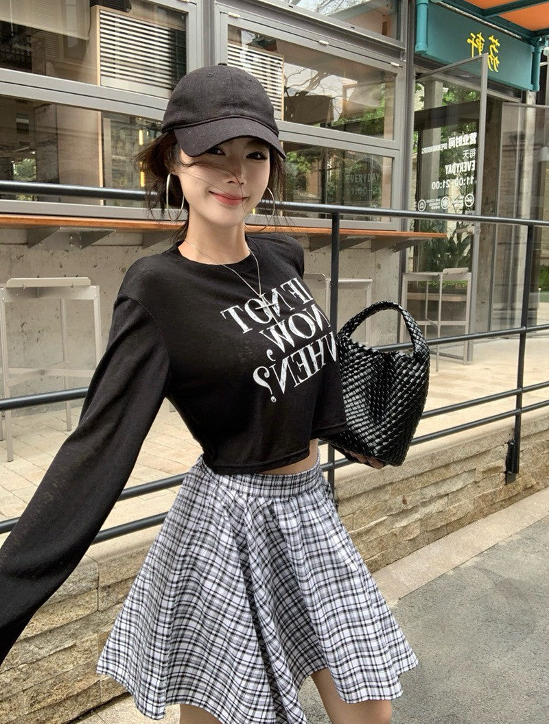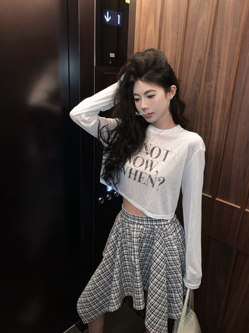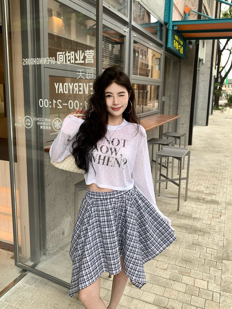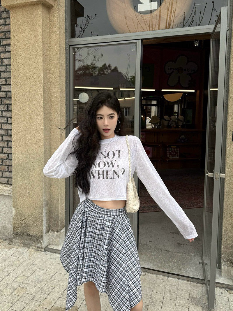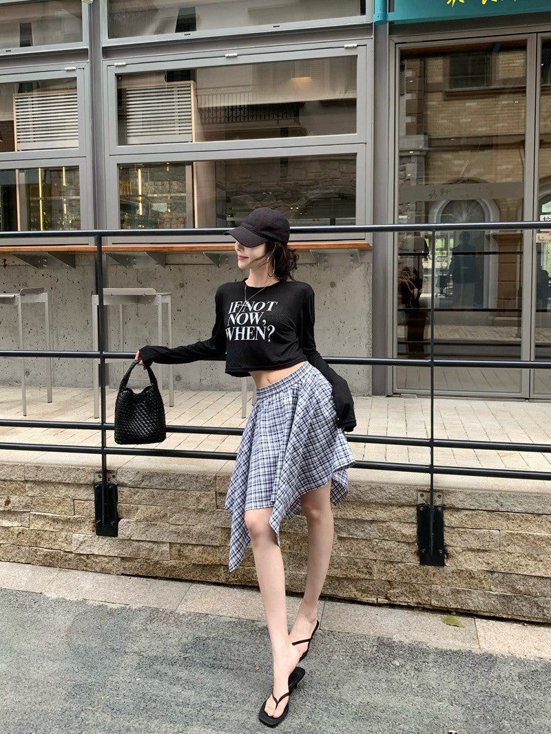 NA+ 百搭休閒空調雪花棉上衣 白/黑 不規則格紋半身裙 黑