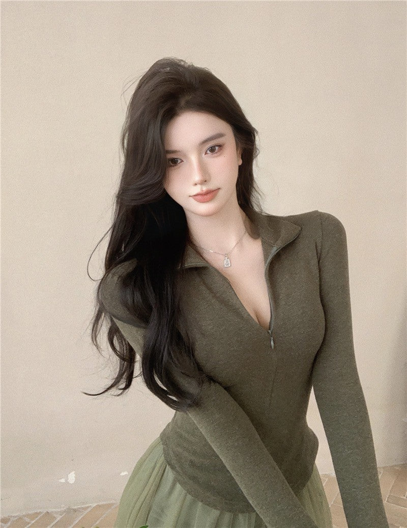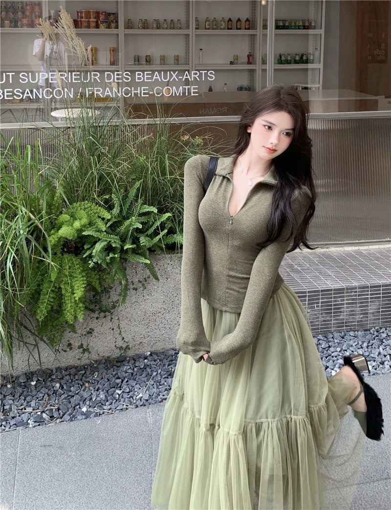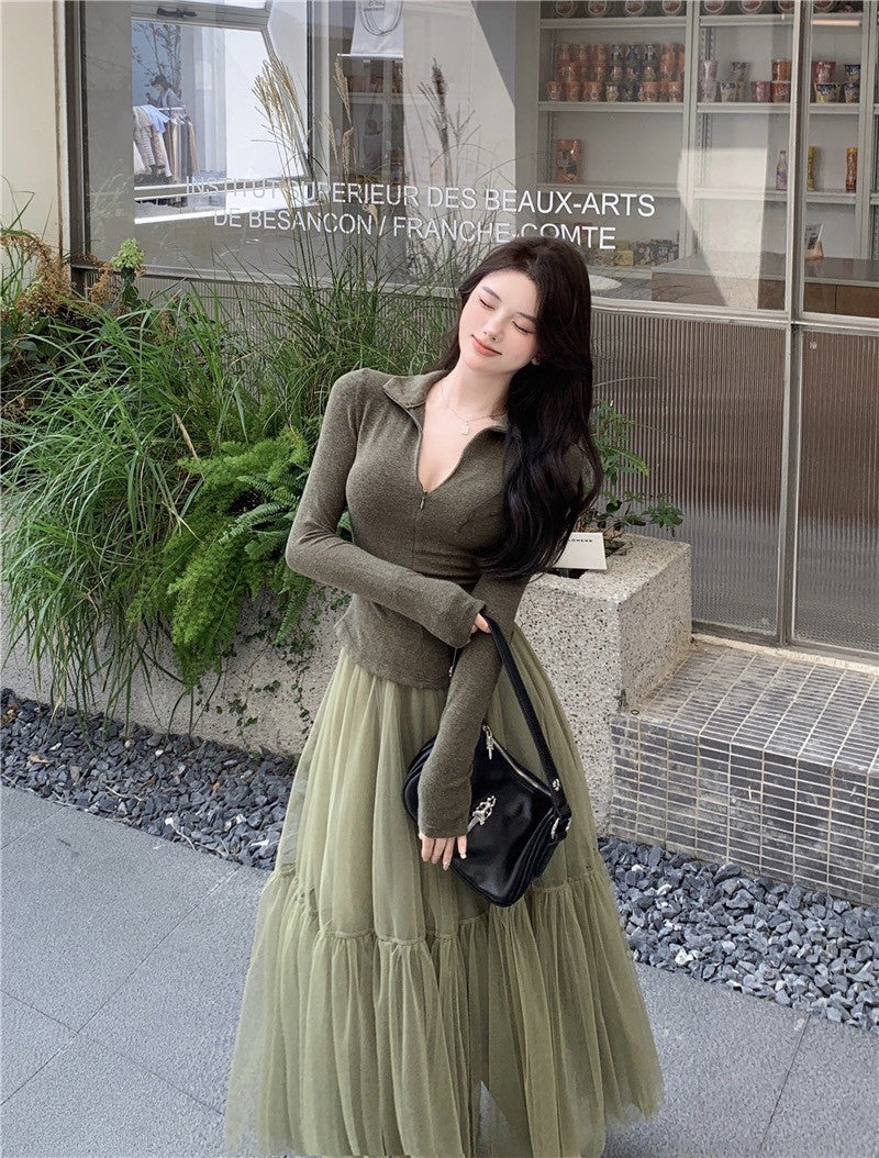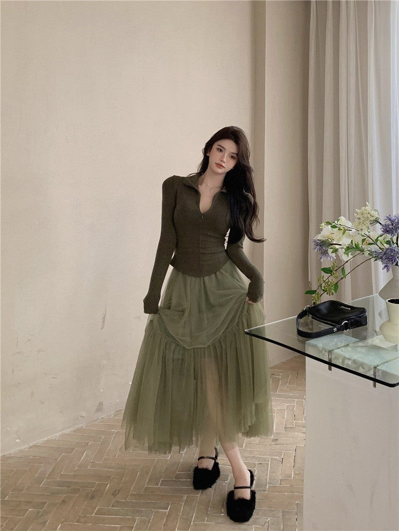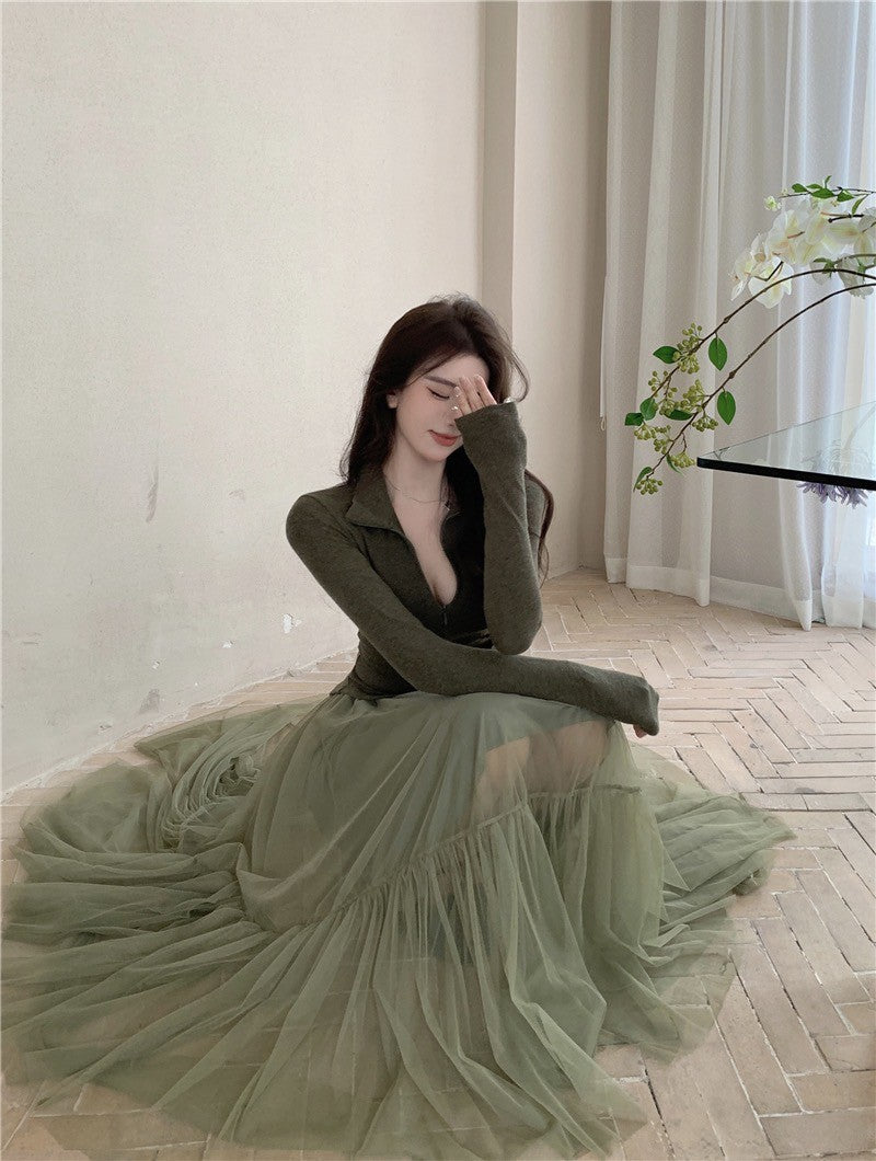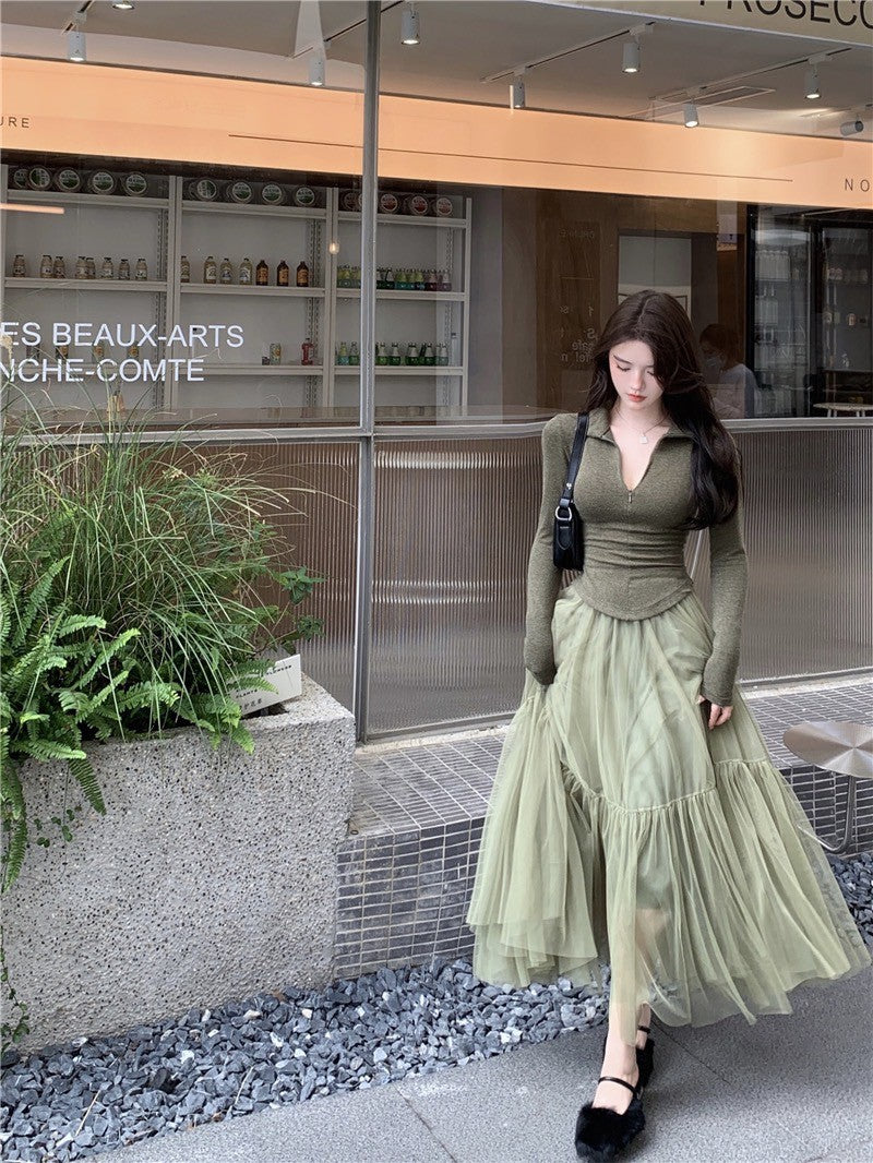 Na+ 禪意綿綿羊駝絨緊身小V領上衣 網紗半身裙