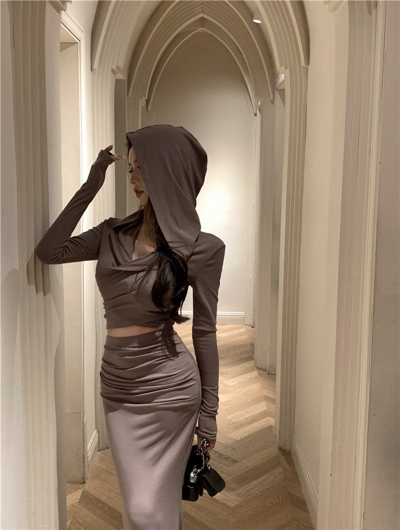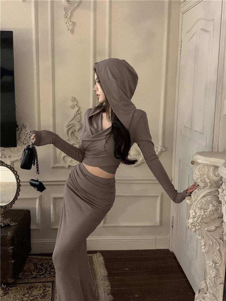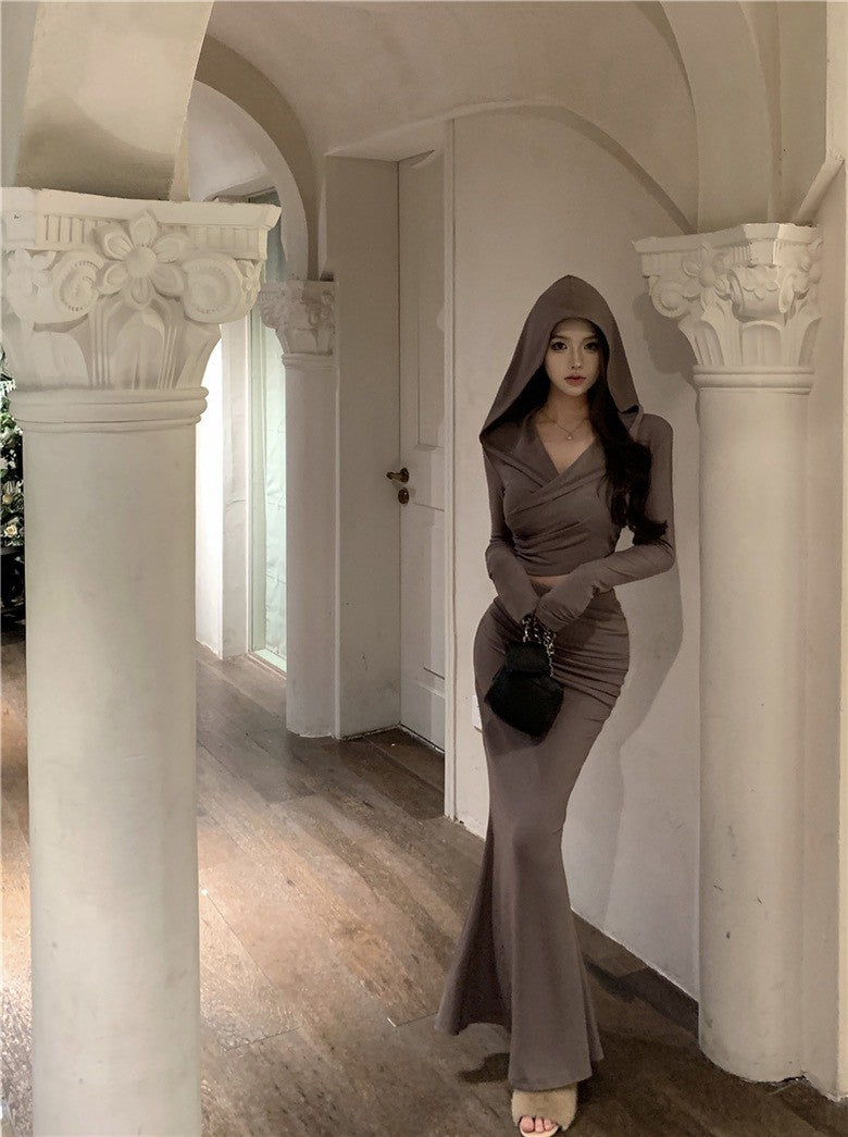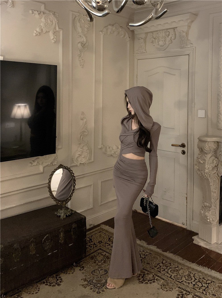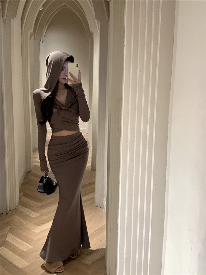 NA+ 「窈窕」復古回歸連帽交錯上衣/魚尾半身裙 沙丘色