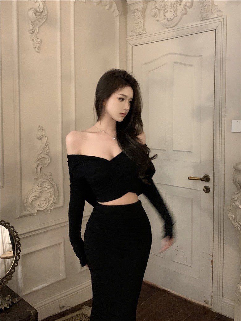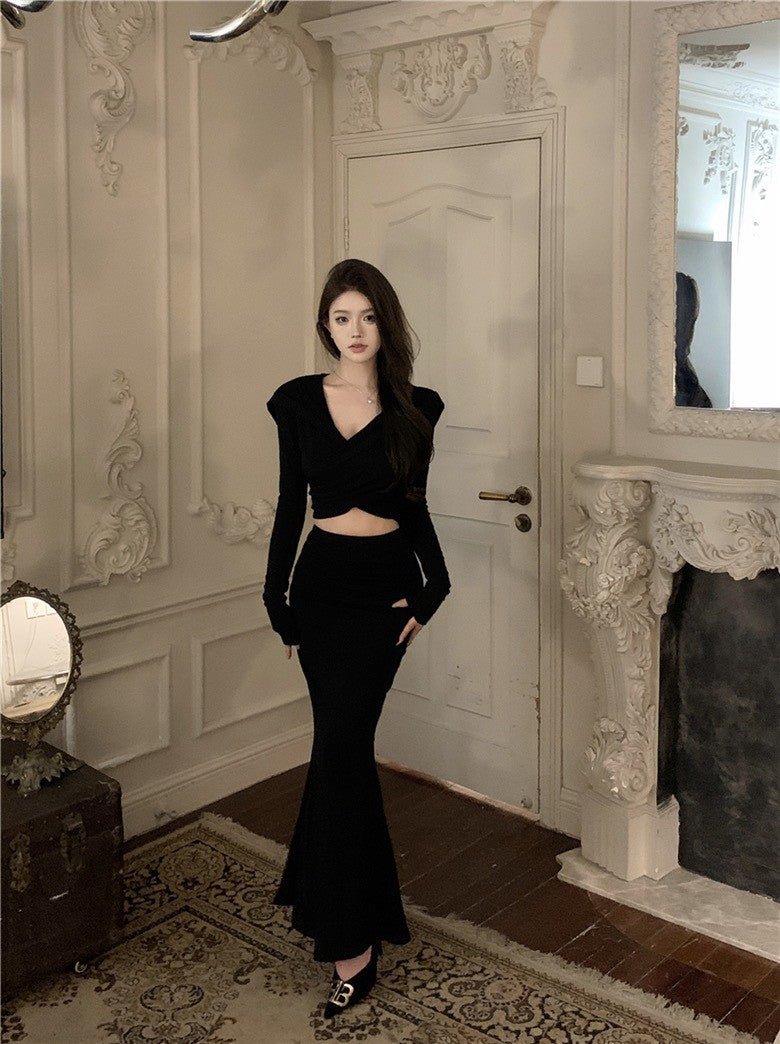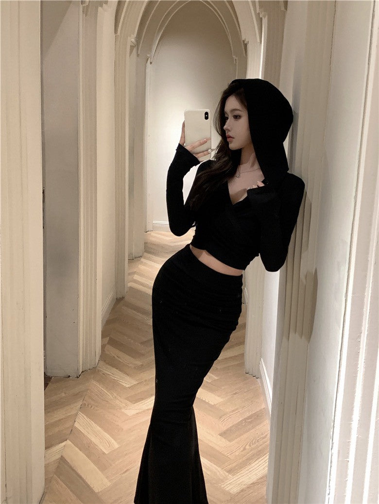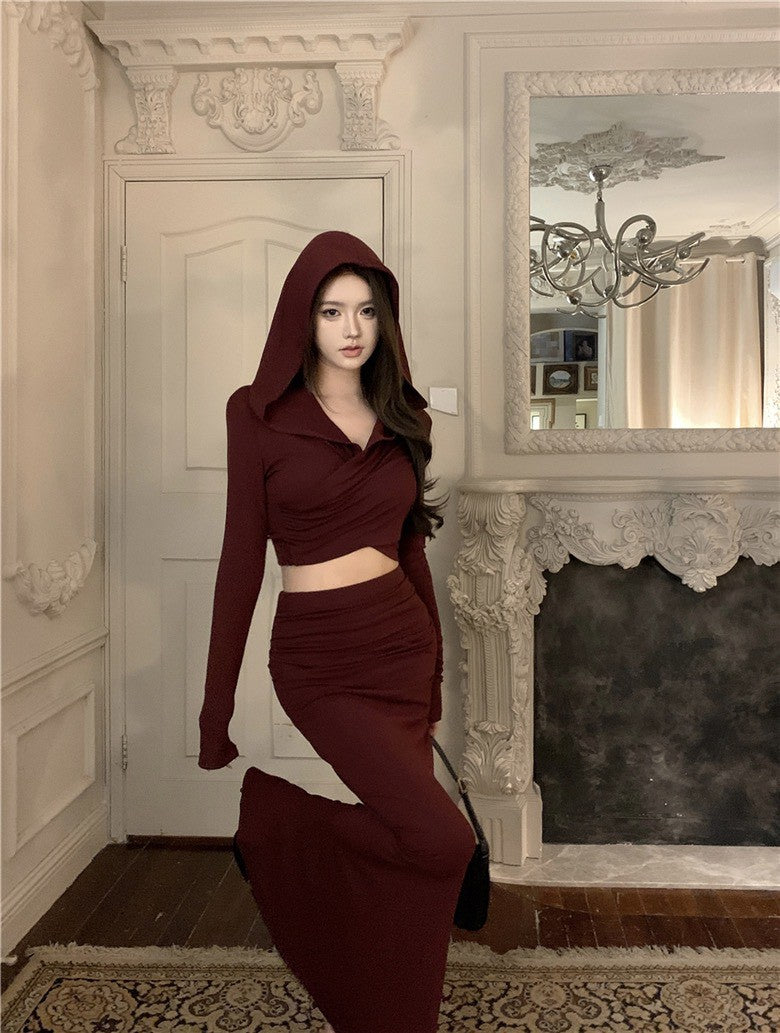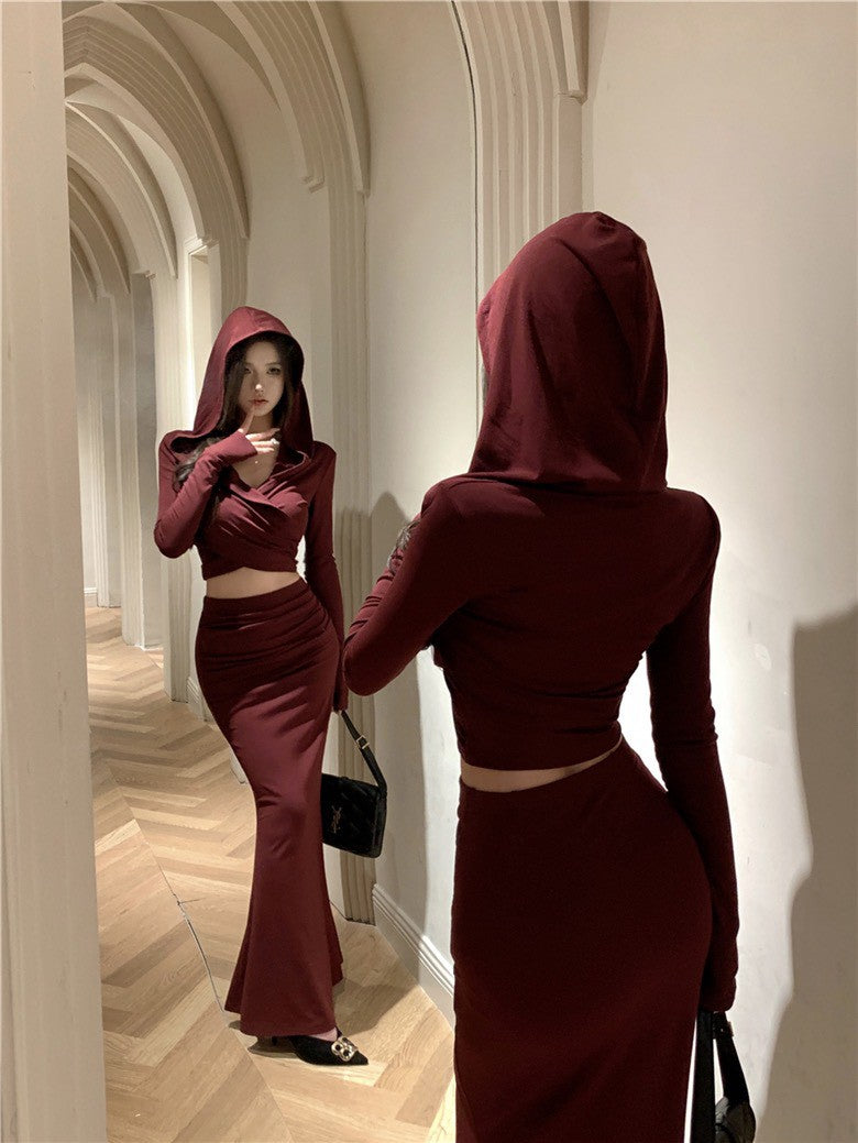 NA+ 「窈窕」復古回歸連帽交錯上衣/魚尾半身裙 波爾多紅/黑