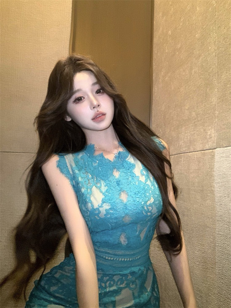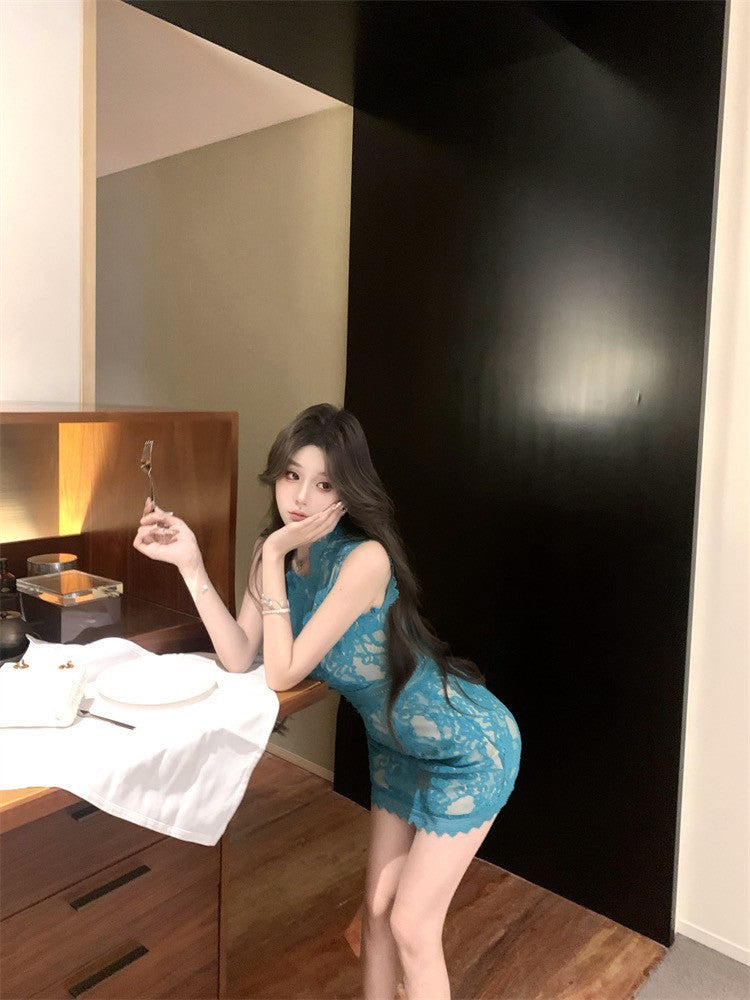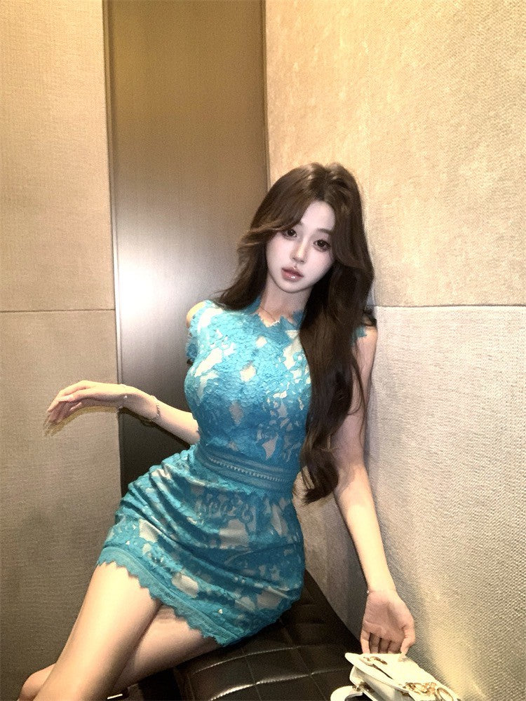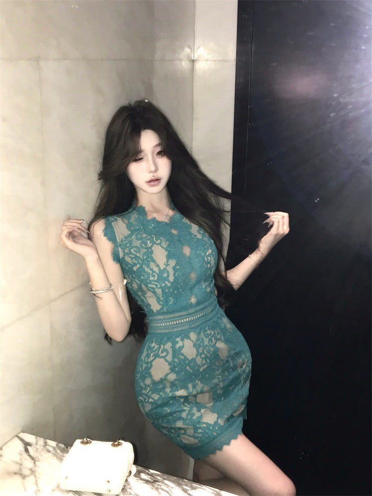 NA+ 竹影漣漪孔雀藍蕾絲包臀連身裙