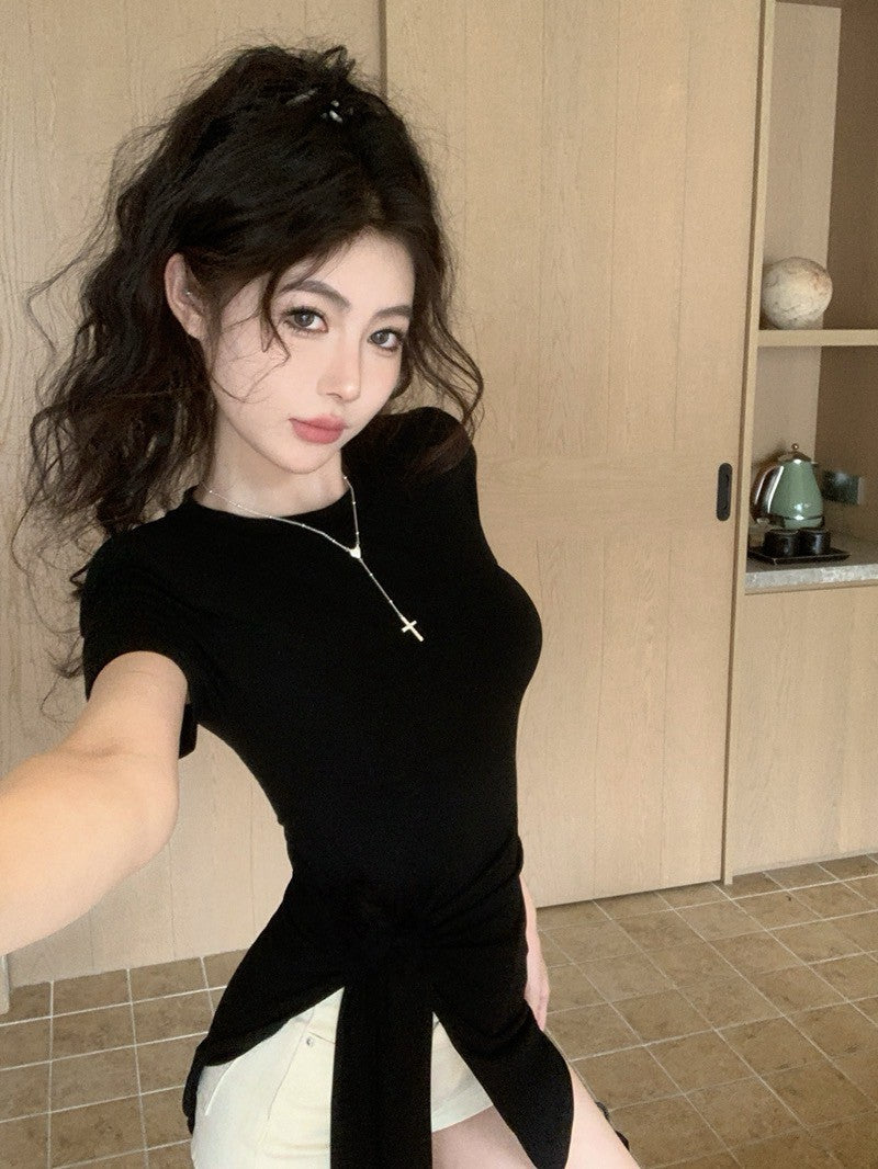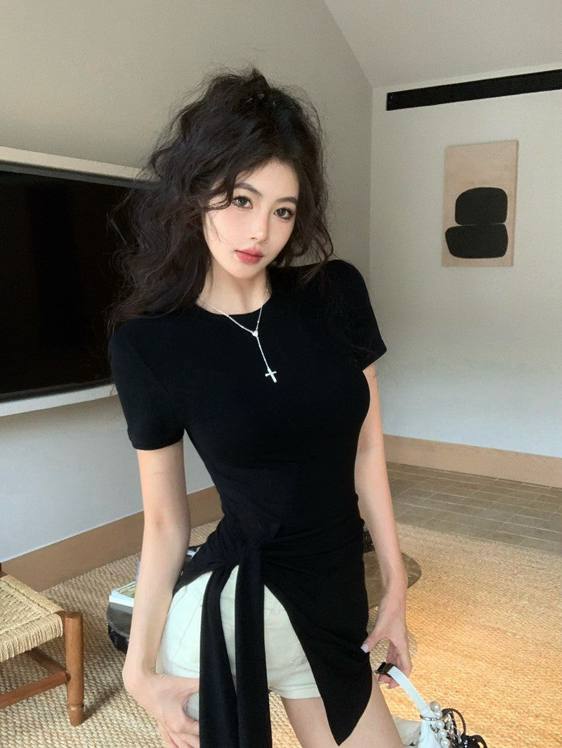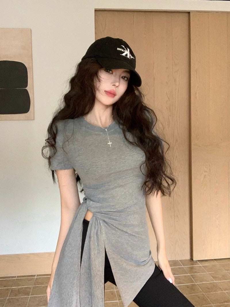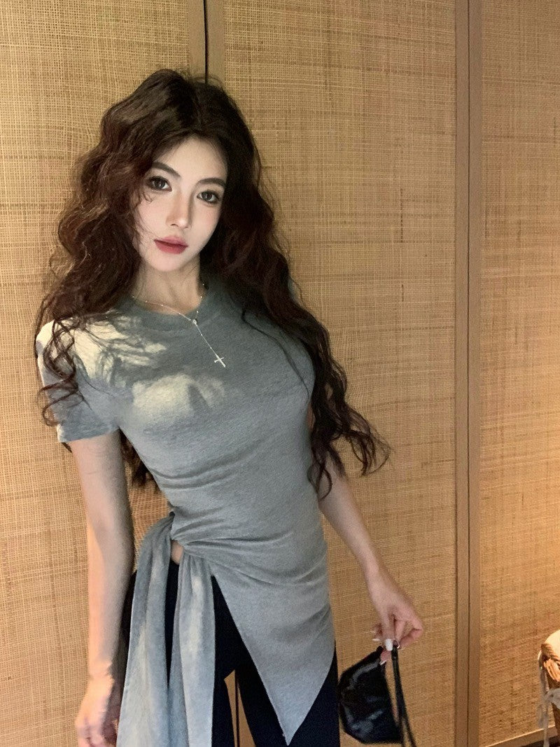 Na+ 簡約圓領側腰開叉顯瘦上衣 灰/黑