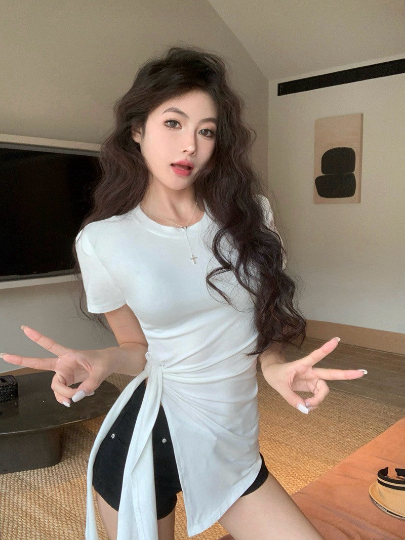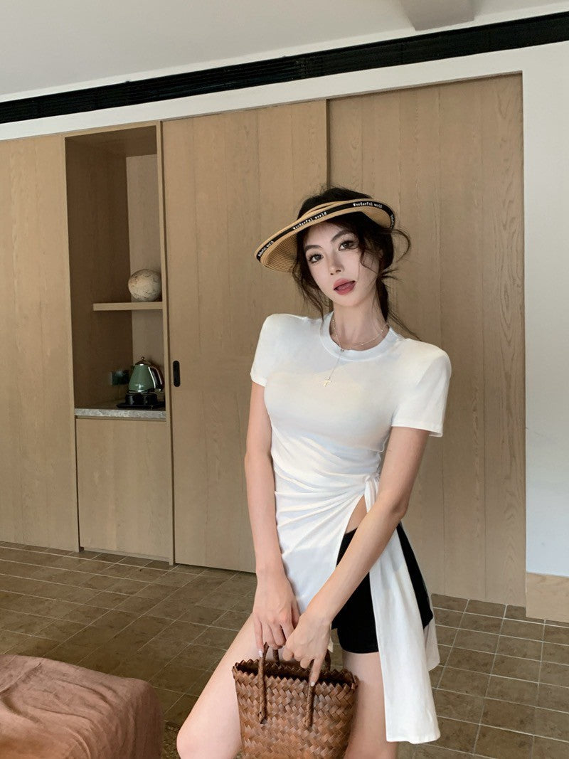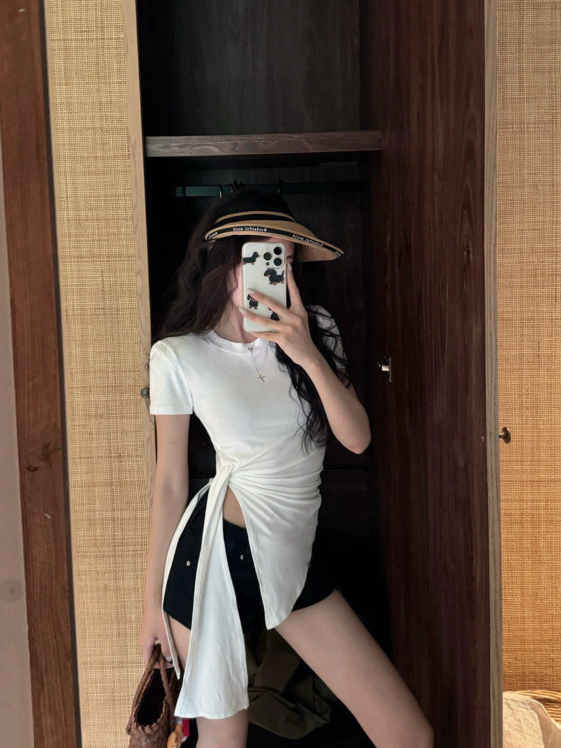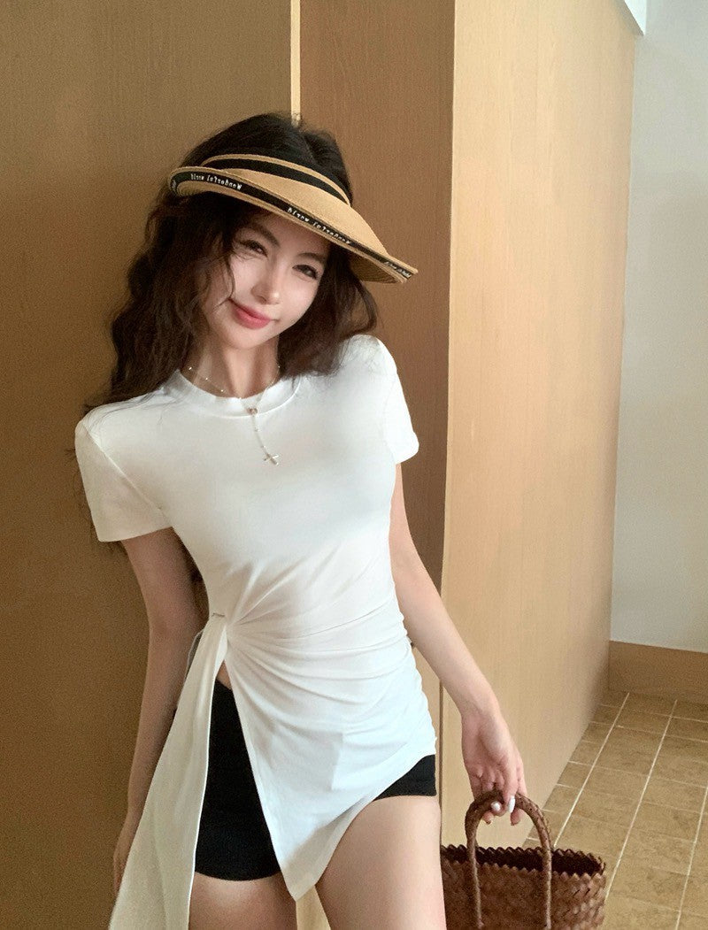 Na+ 簡約圓領側腰開叉顯瘦上衣 白