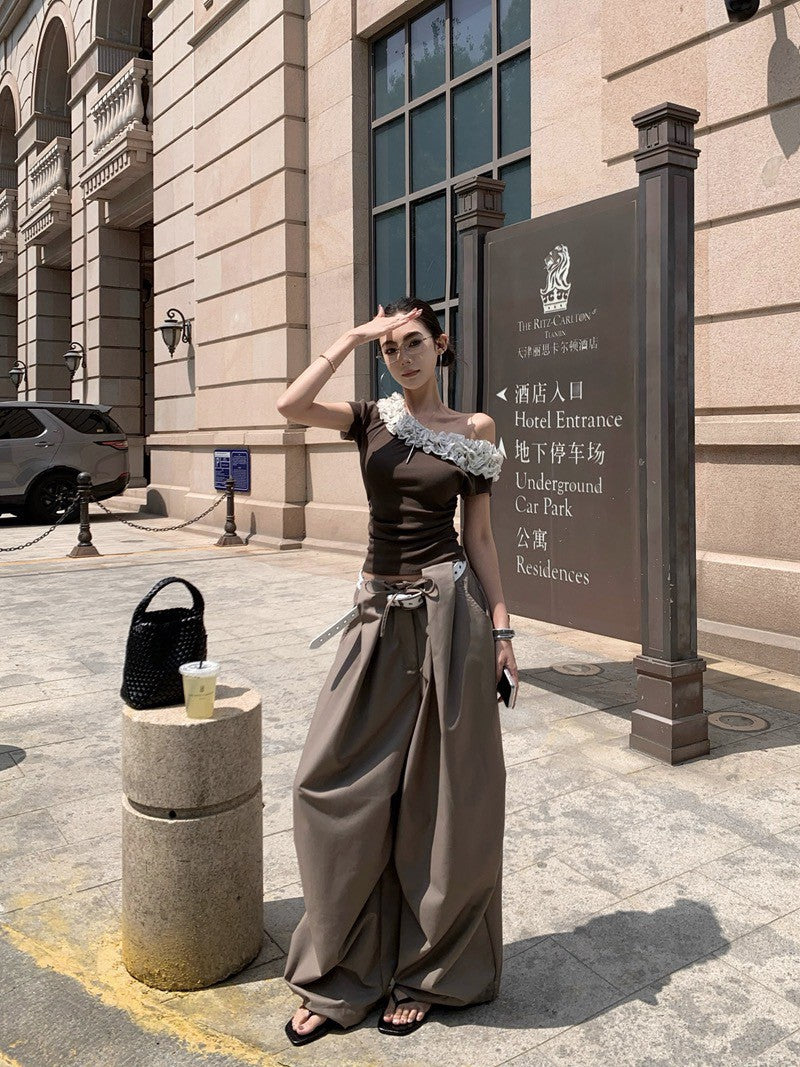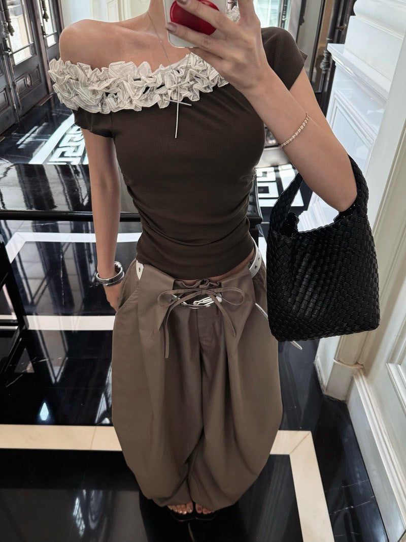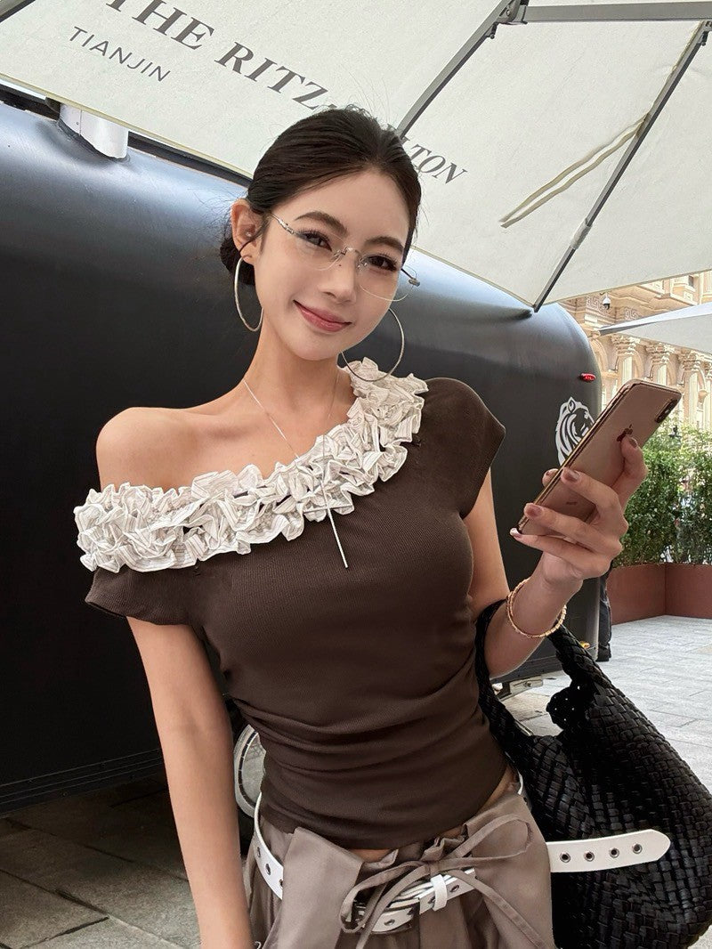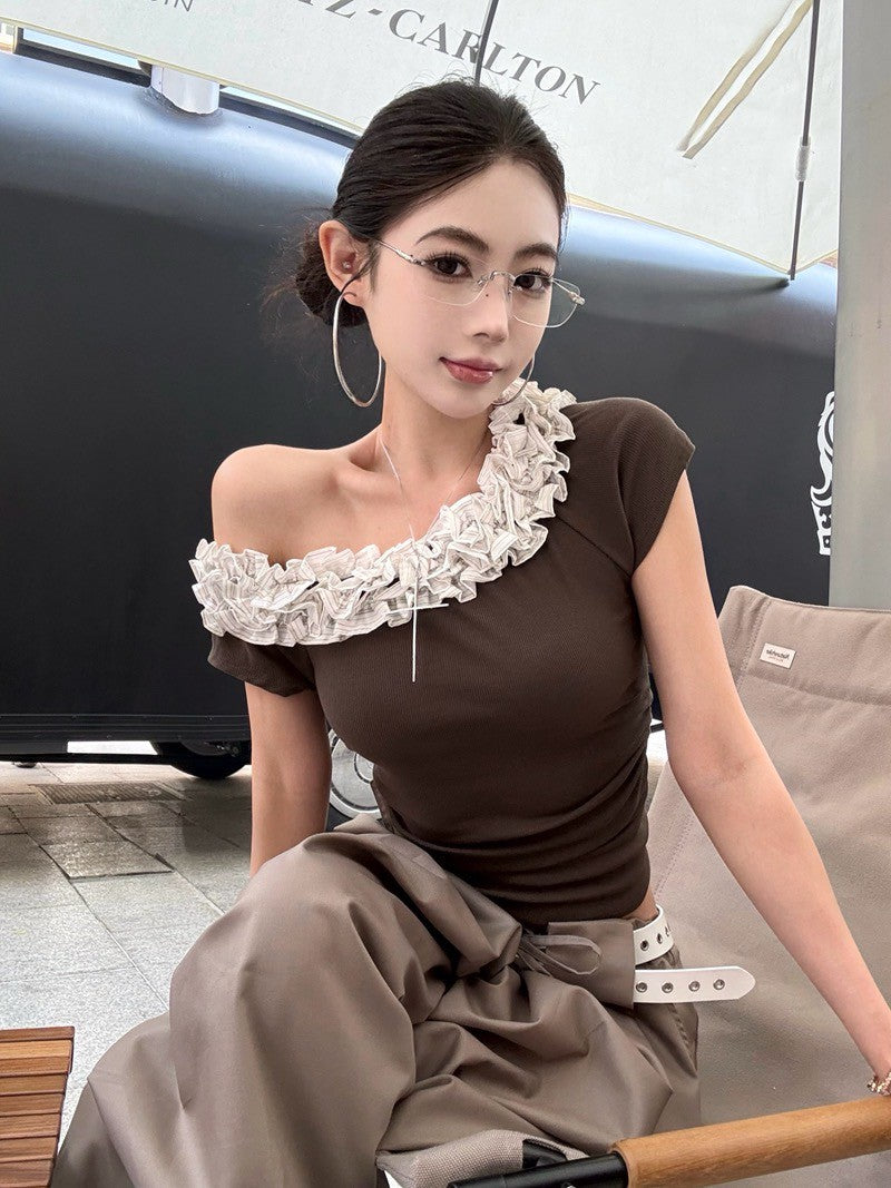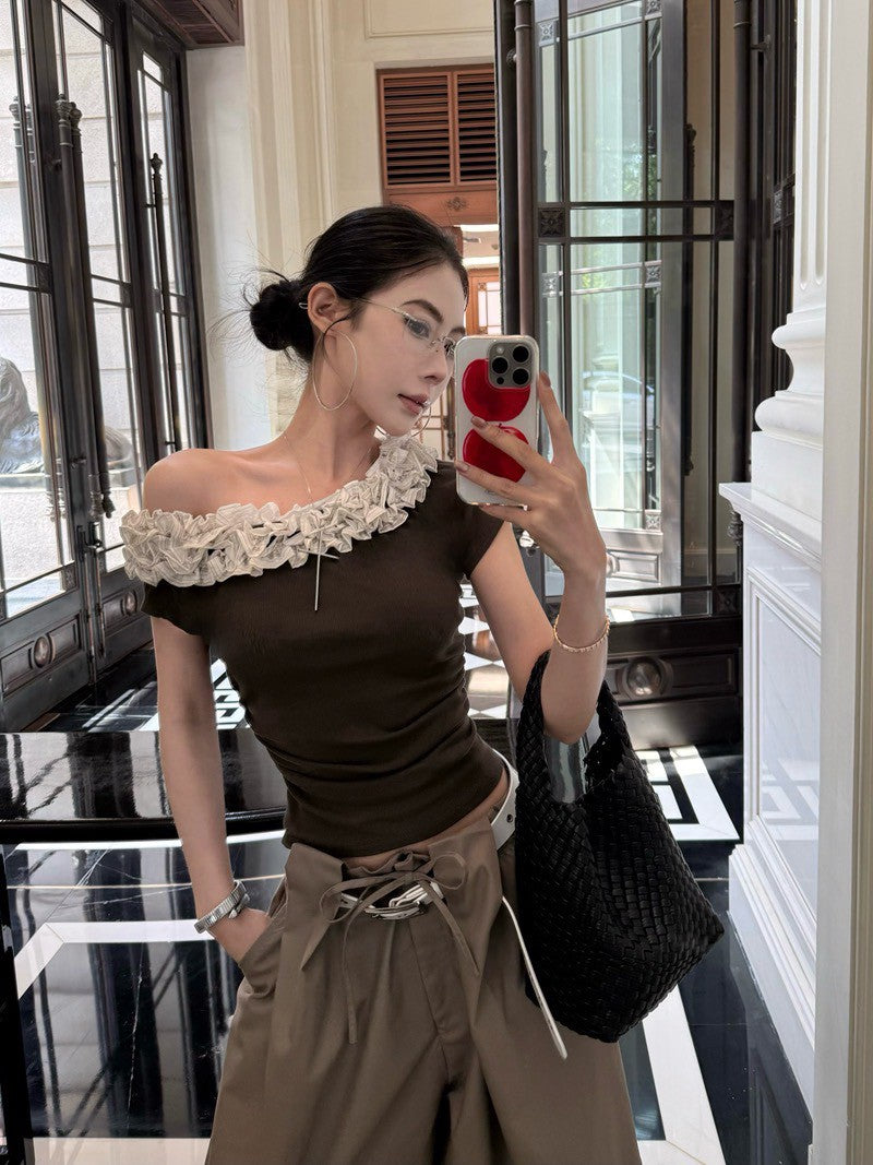 NA+ 簡約斜肩立體花邊拼接上衣 咖
