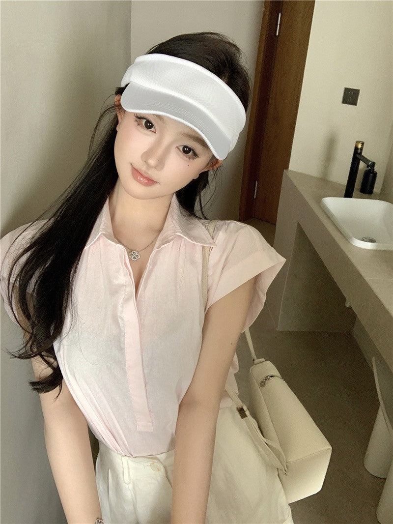 Na+ 簡約鬆弛感小飛袖襯衫 粉 高腰反折白短褲