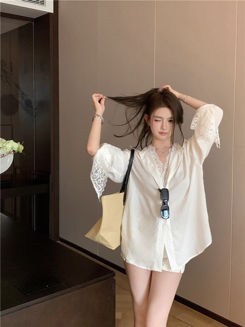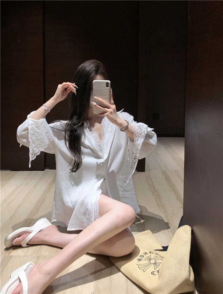 NA+ 純色蕾絲百搭夾兩件拼接襯衫