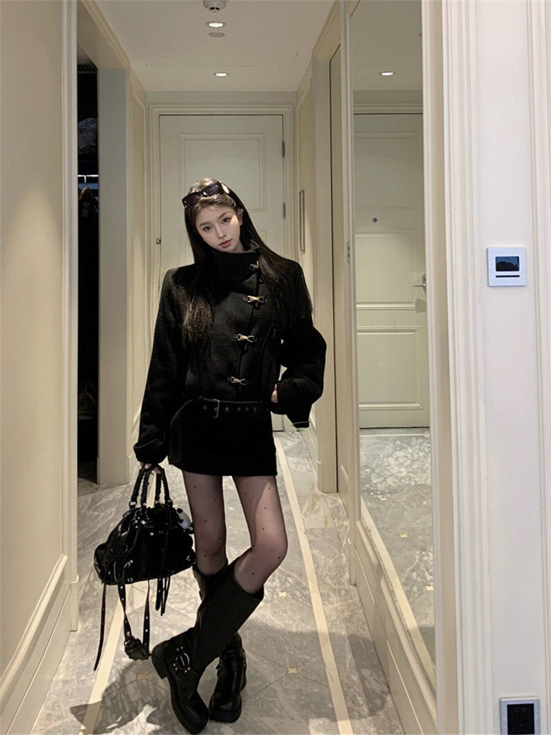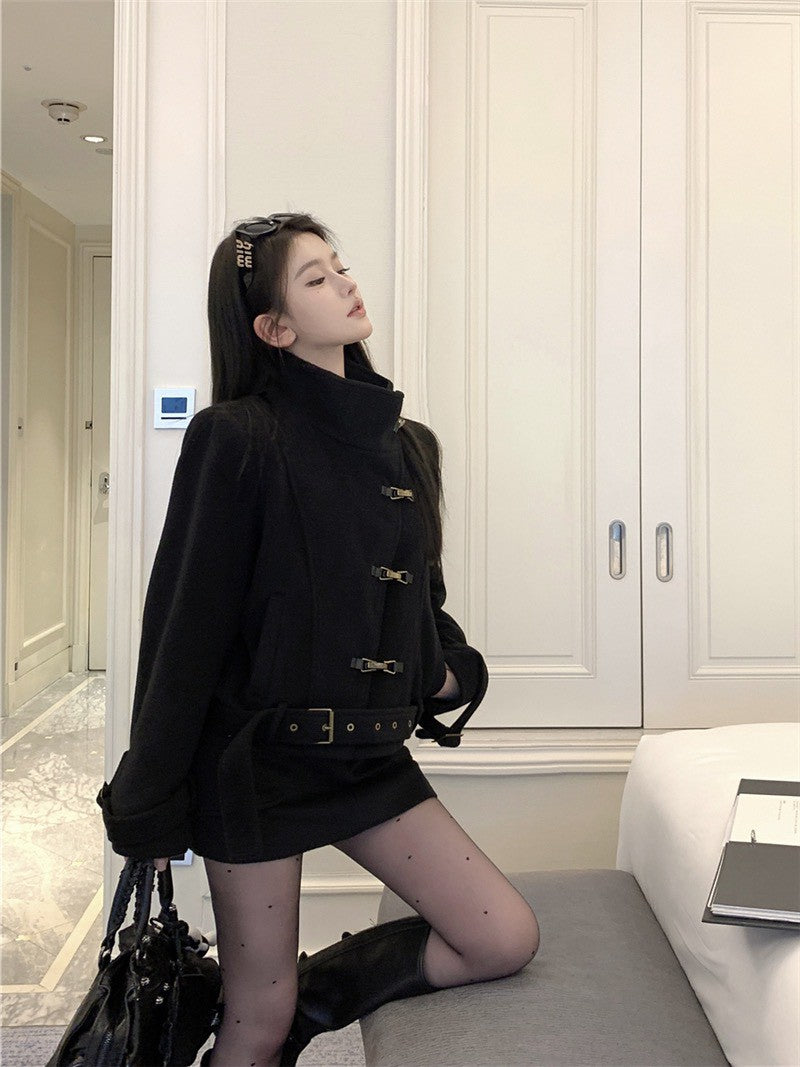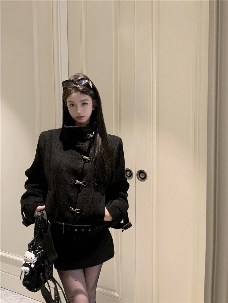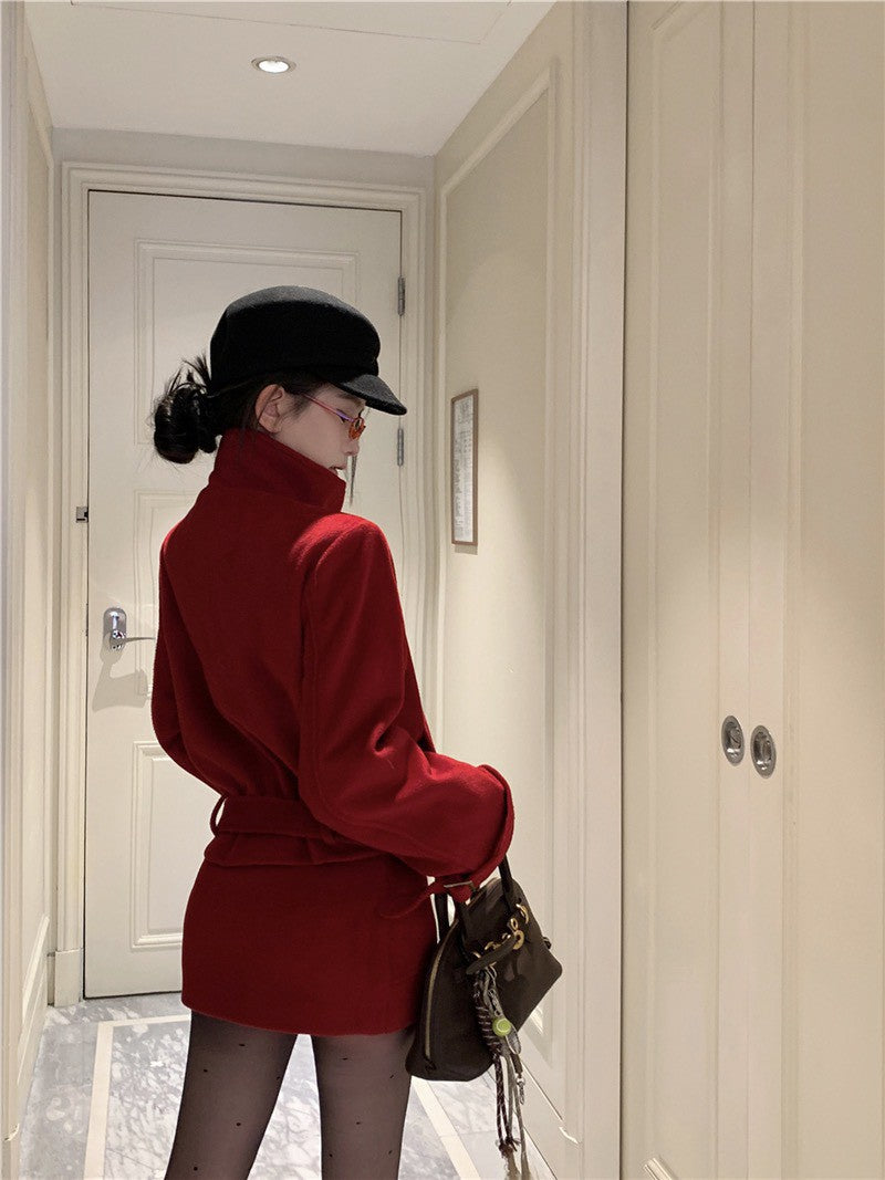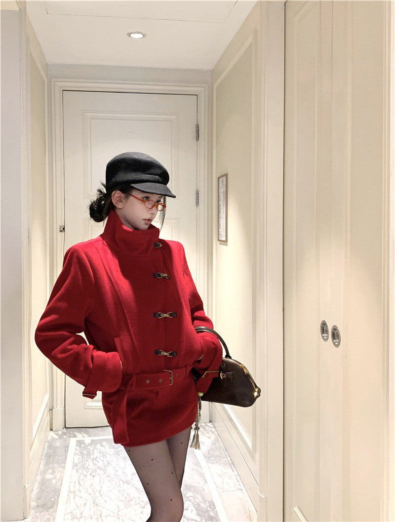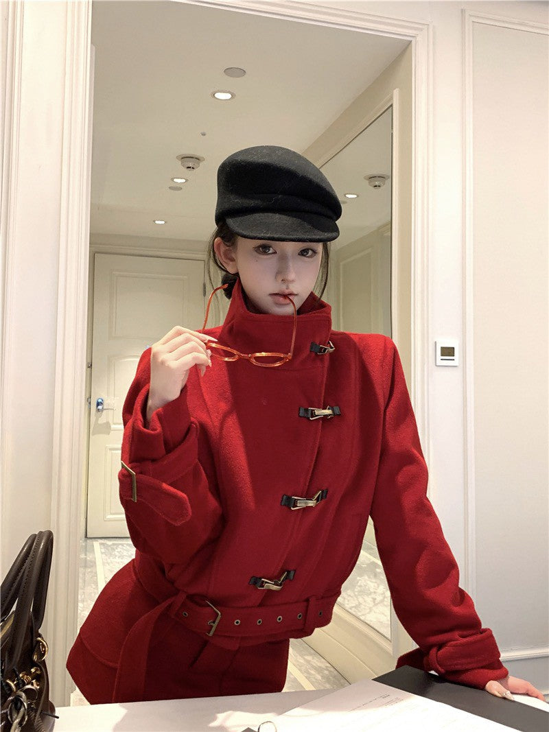 NA+ 締造千金溫暖毛呢側釦立領外套 黑/紅