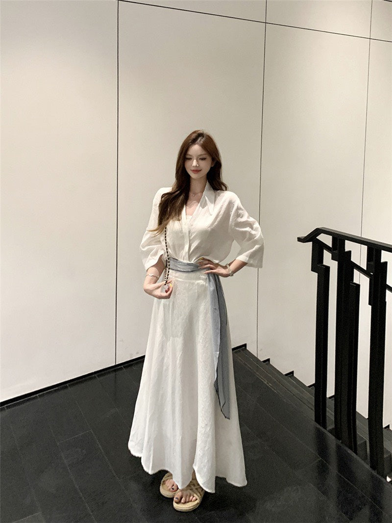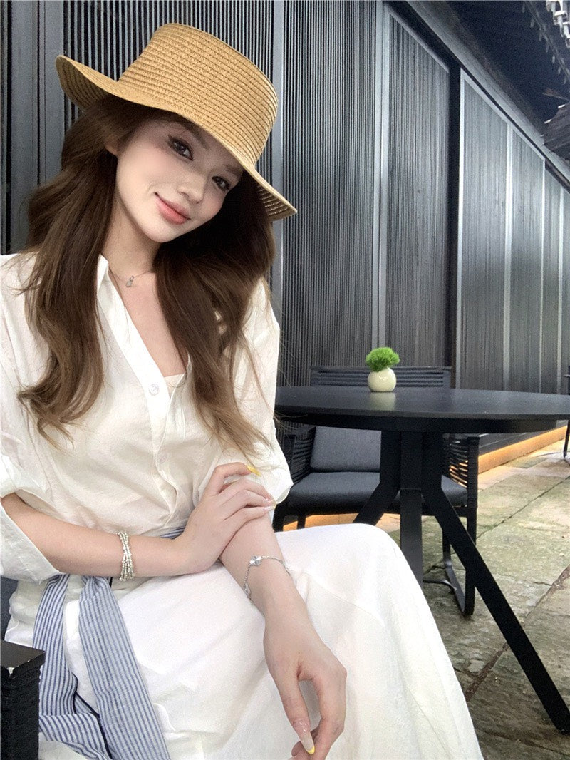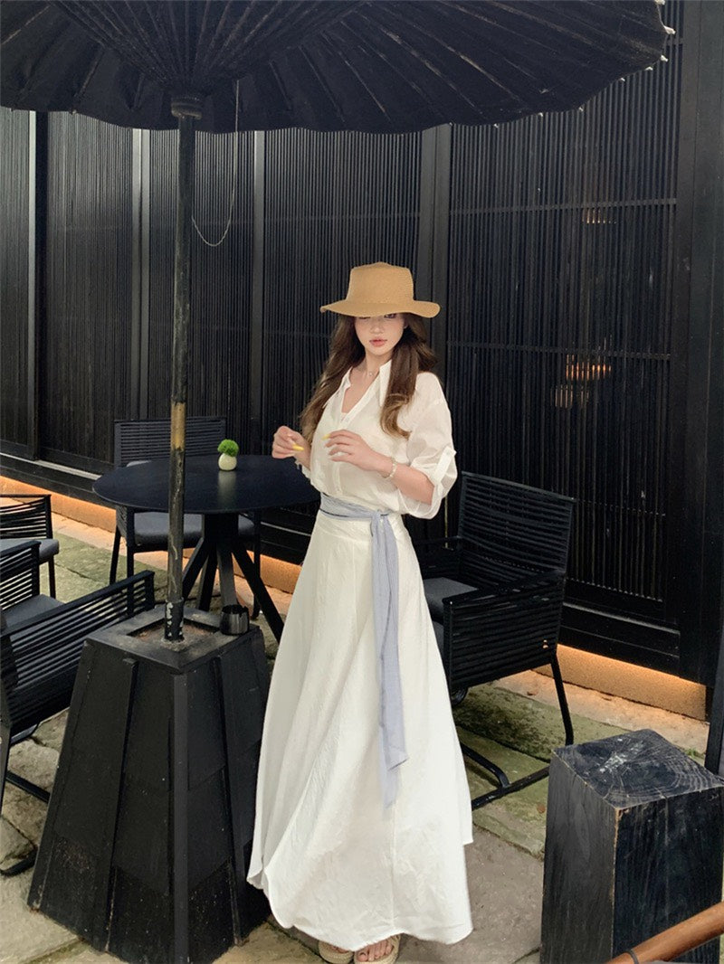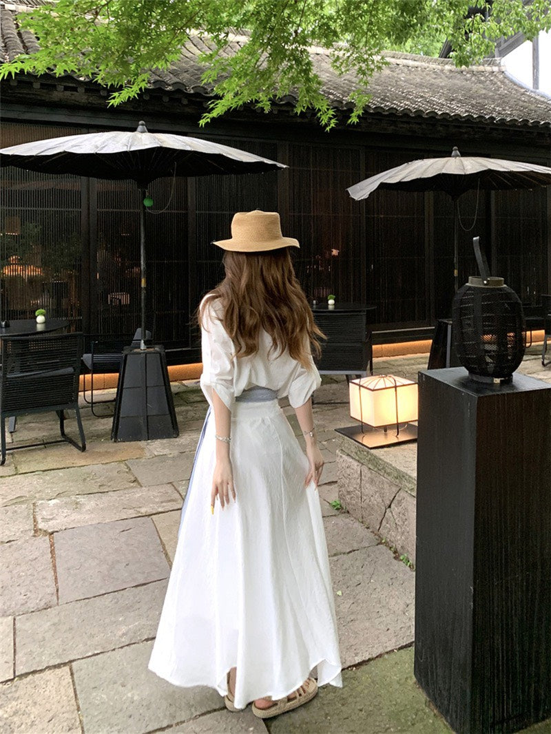 NA+ 老錢度假修身慵懶襯衫/高腰半身裙 白