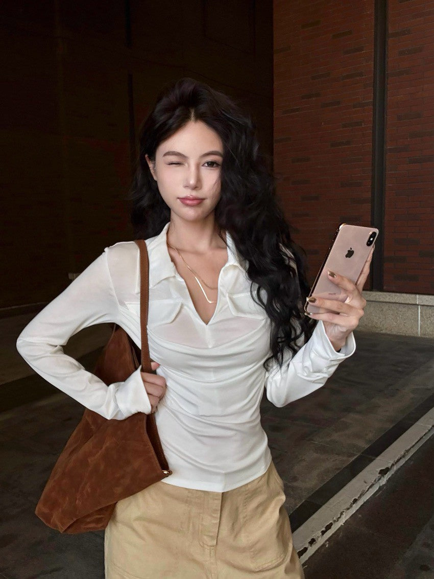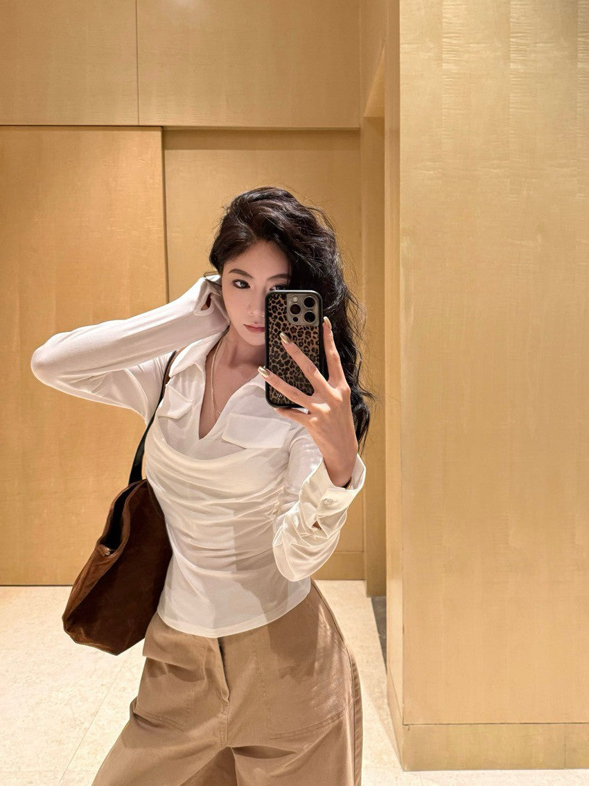 NA+ 職風休閒假兩件疊穿polo領正肩修身上衣 白/黑