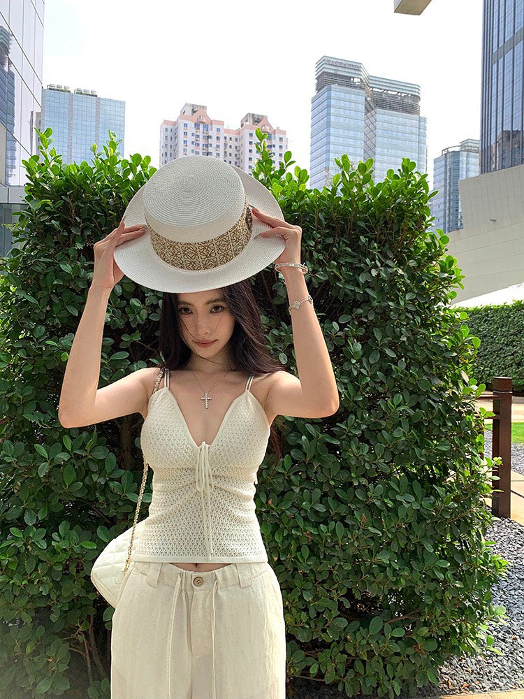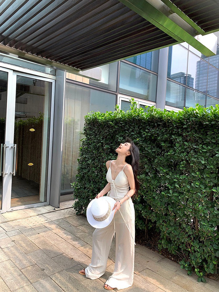 NA+ 華夫格鬆餅帶胸墊度假休閒背心 白 亞麻涼爽呼吸休閒褲
