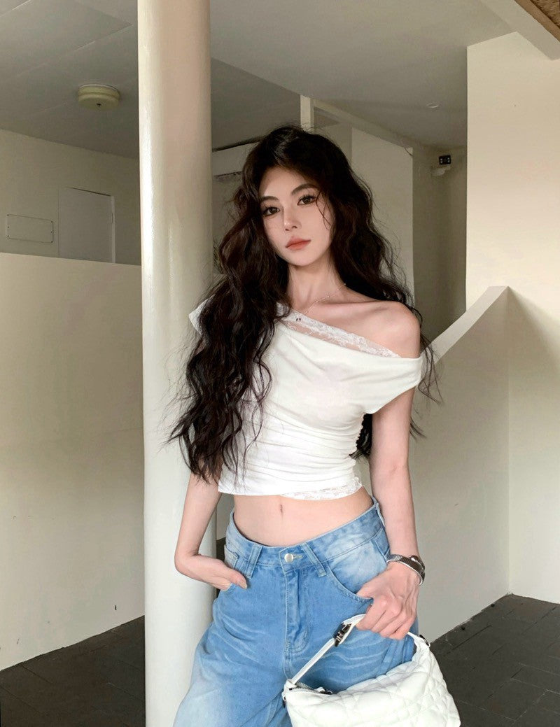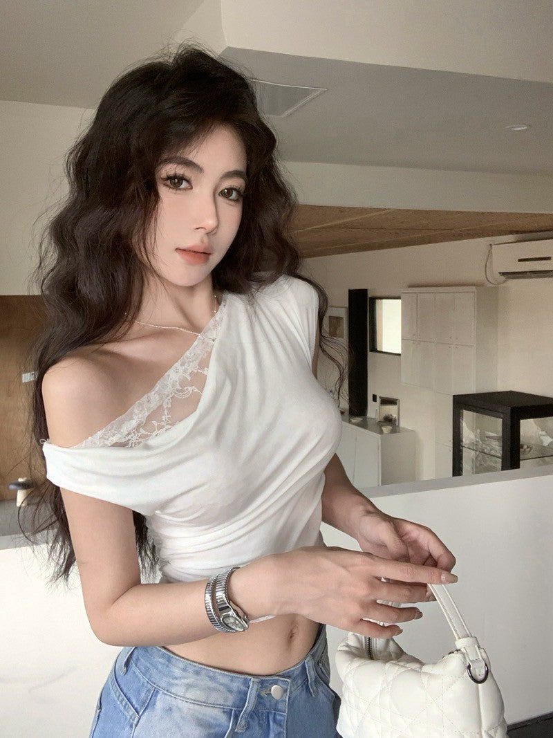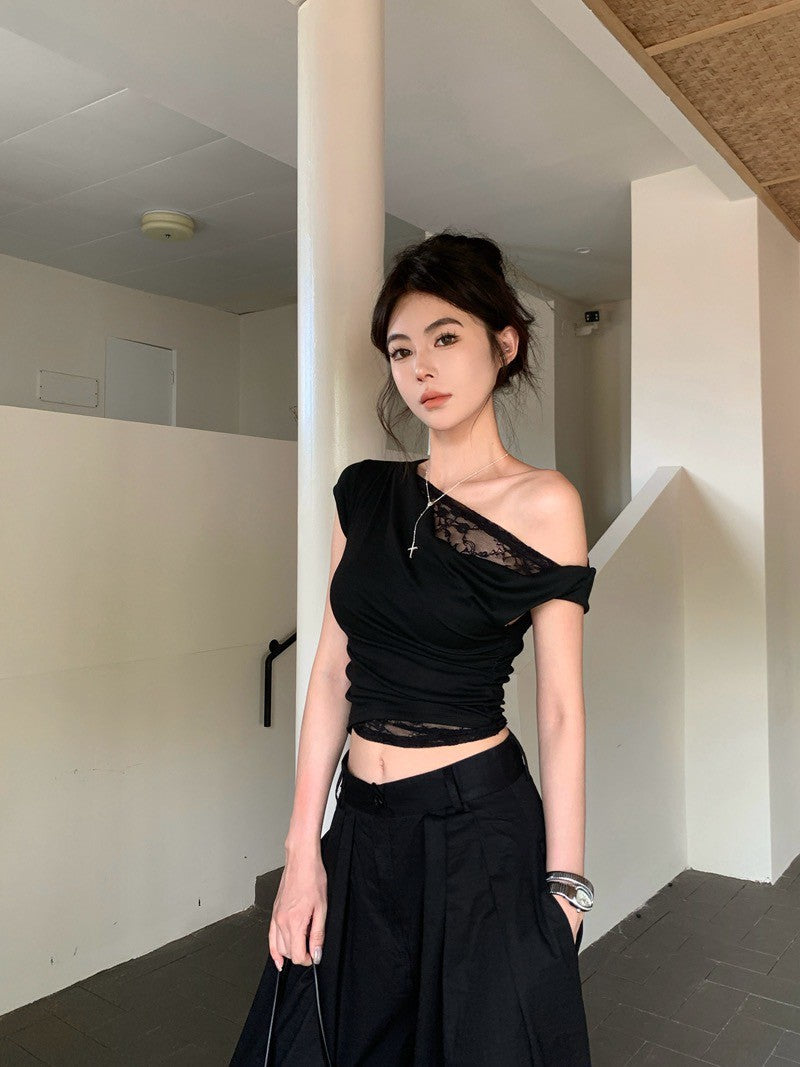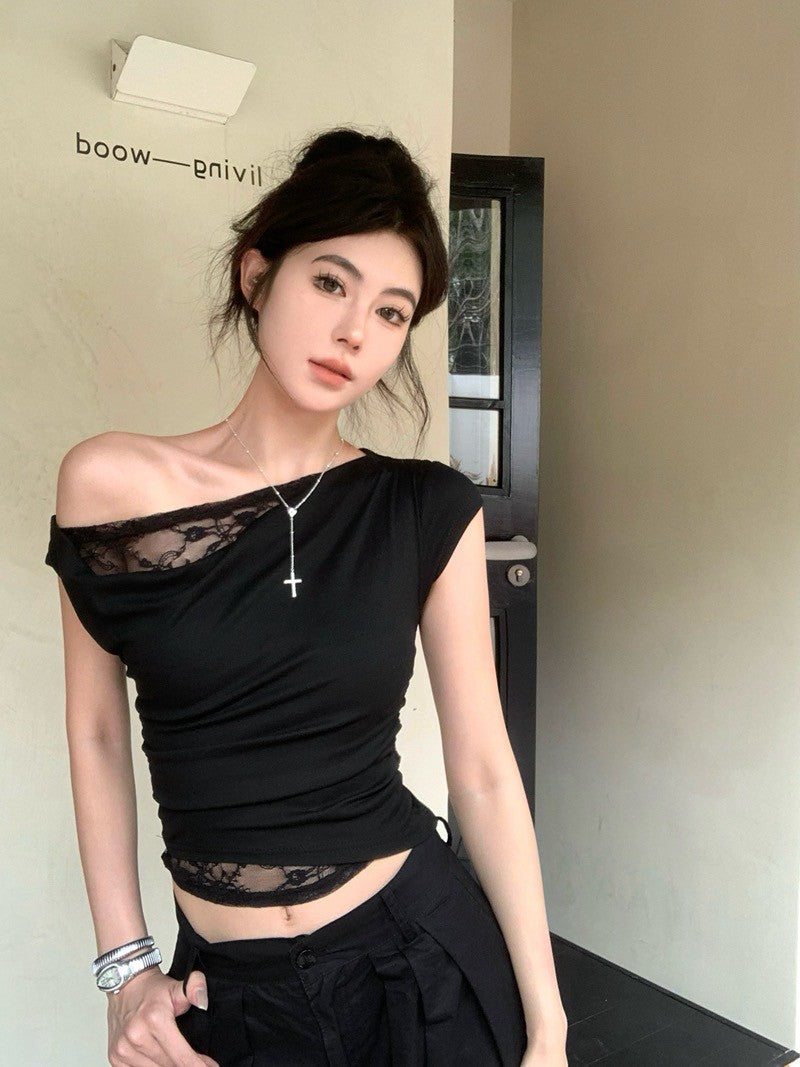 NA+ 蕾絲公主拼接蘯領斜肩上衣 白/黑