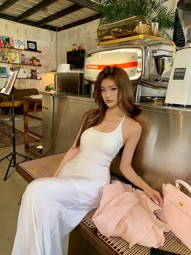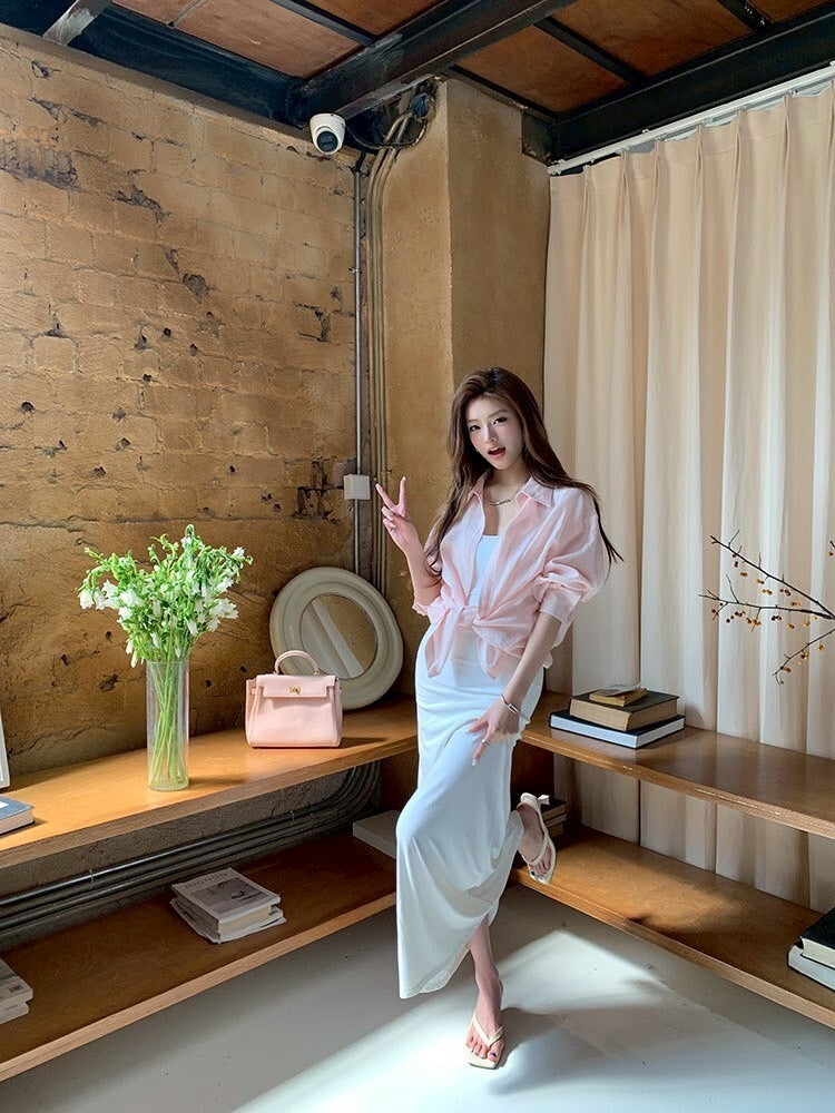 NA+ 超模私服 修身簡約白色連身裙/粉色襯衫