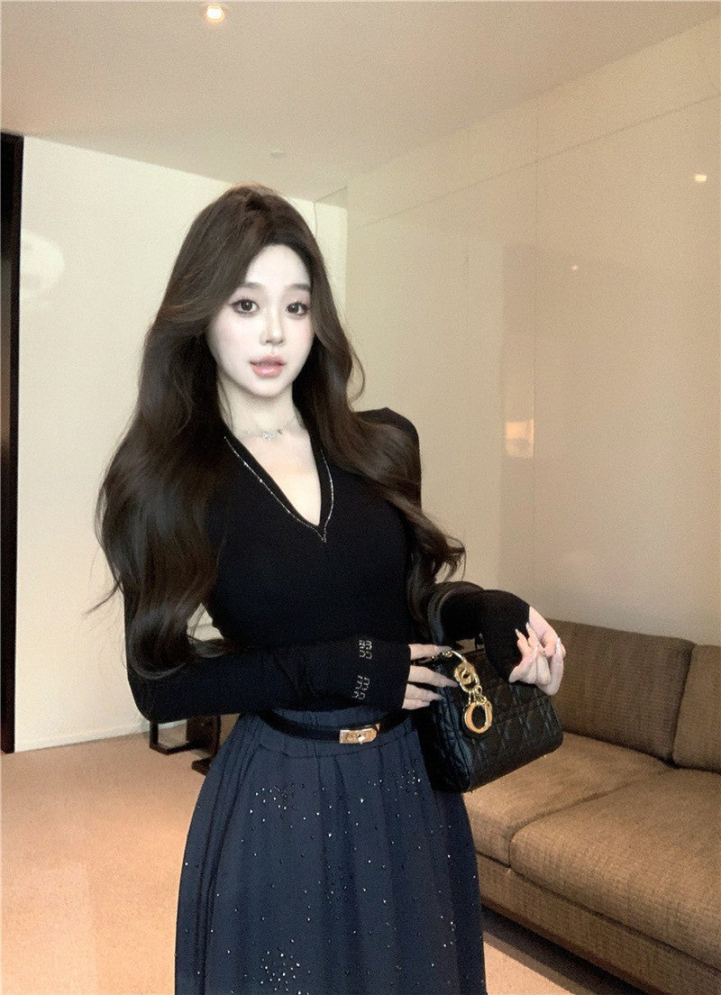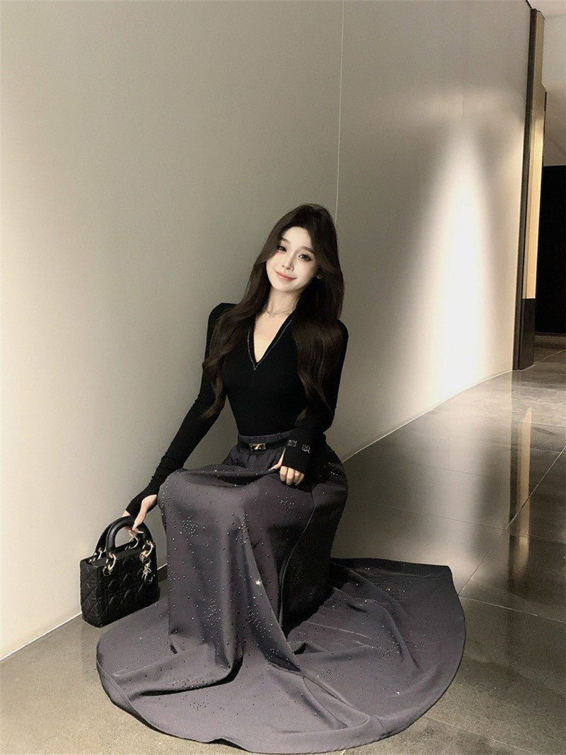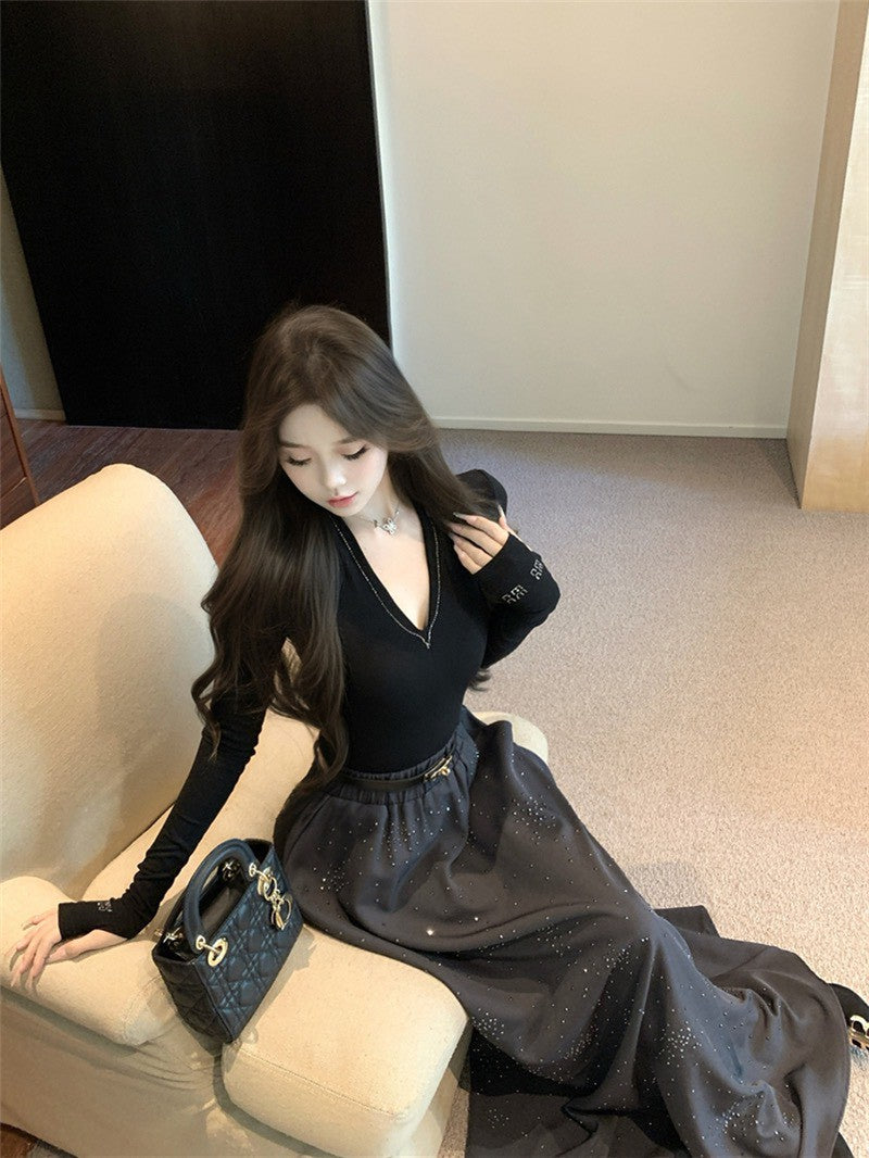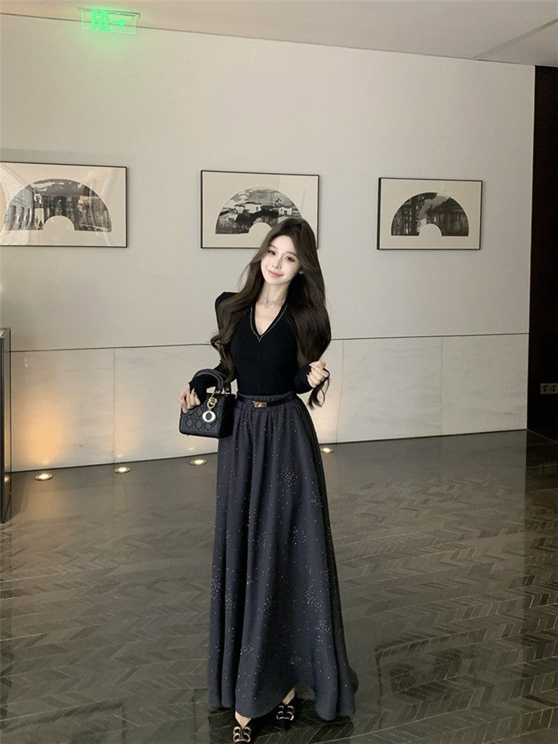 NA+ 輕奢復古修身上衣 燙鑽大裙擺半身裙 黑