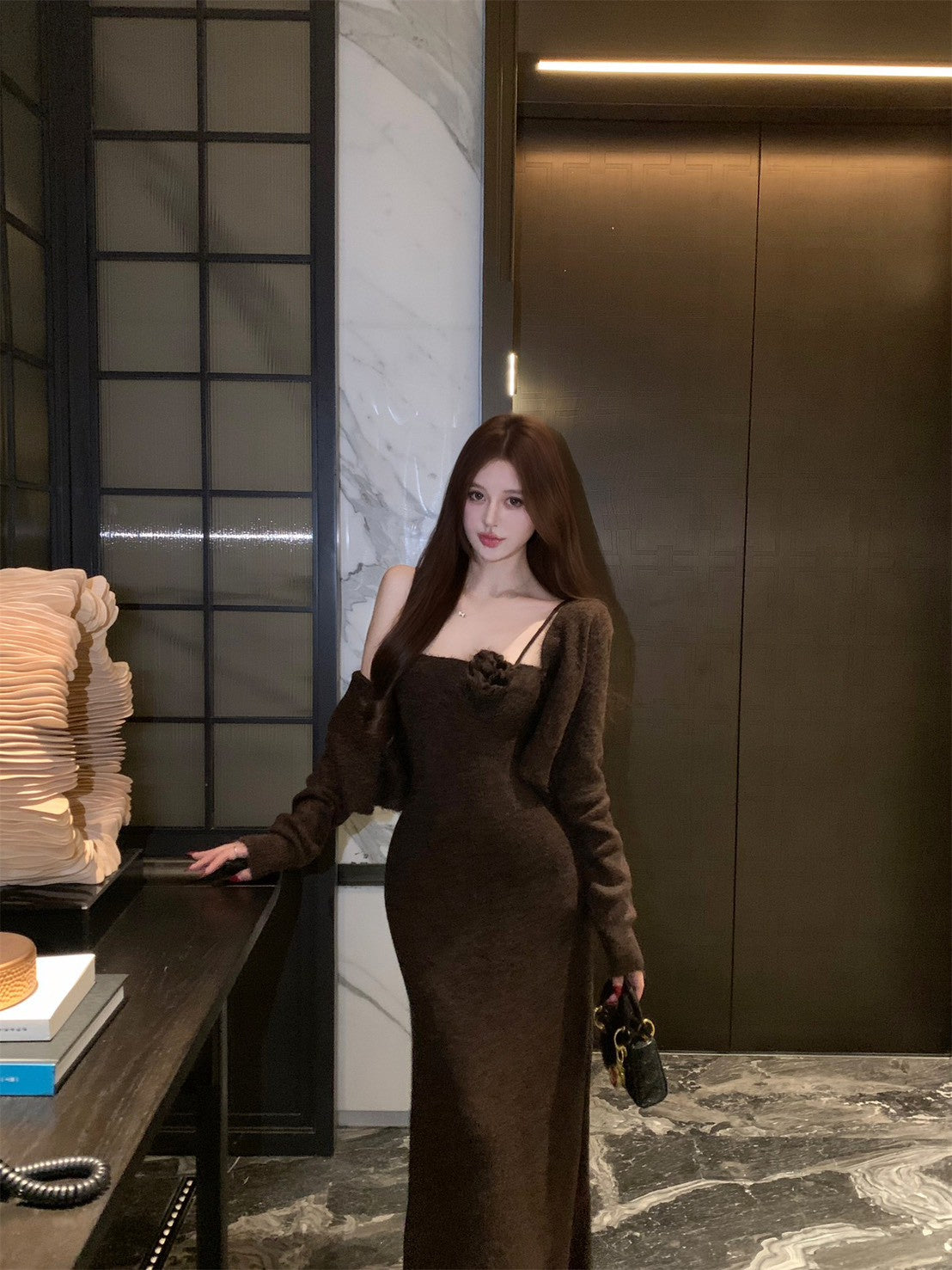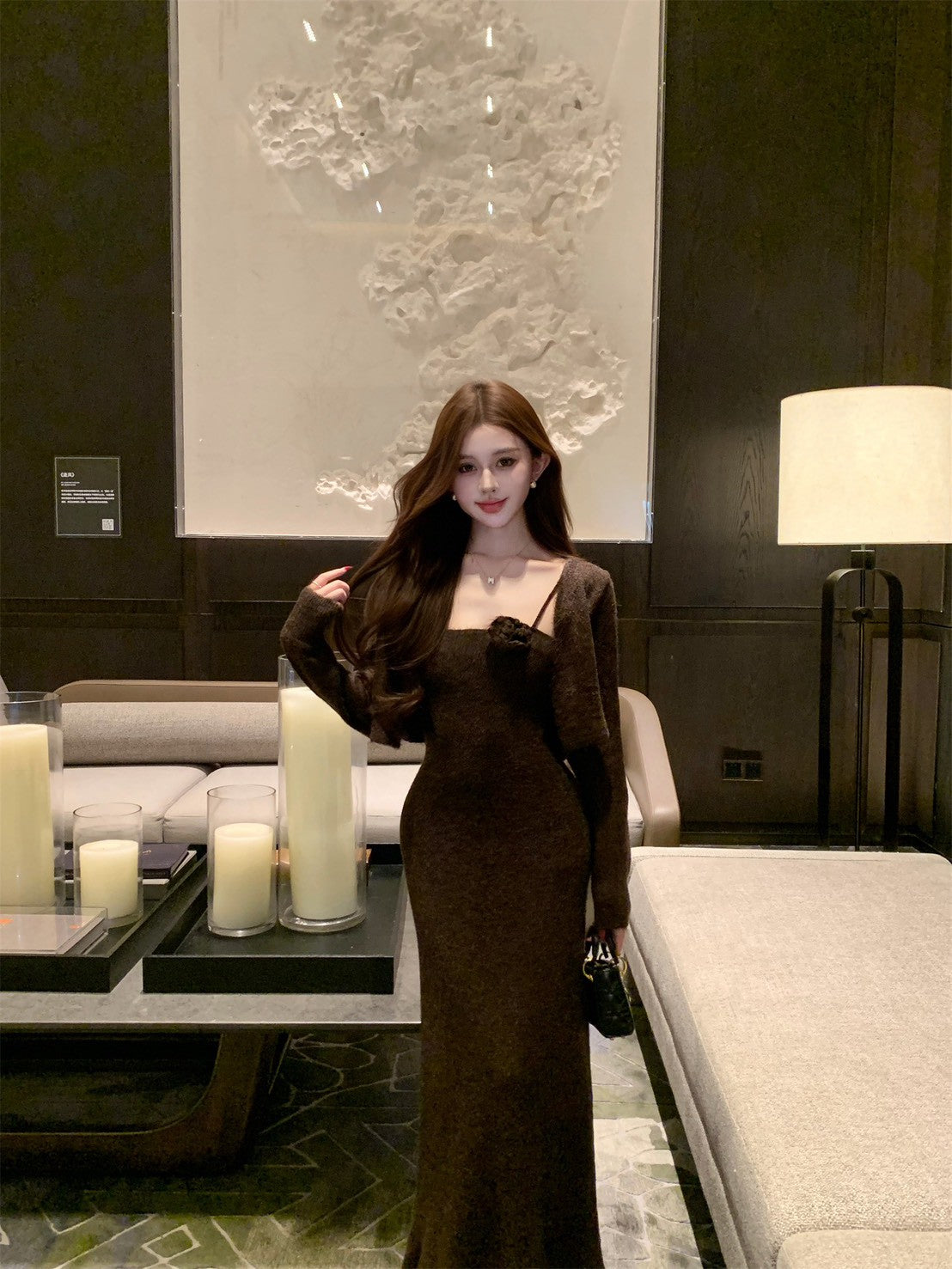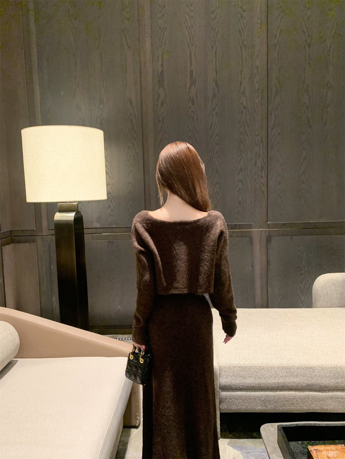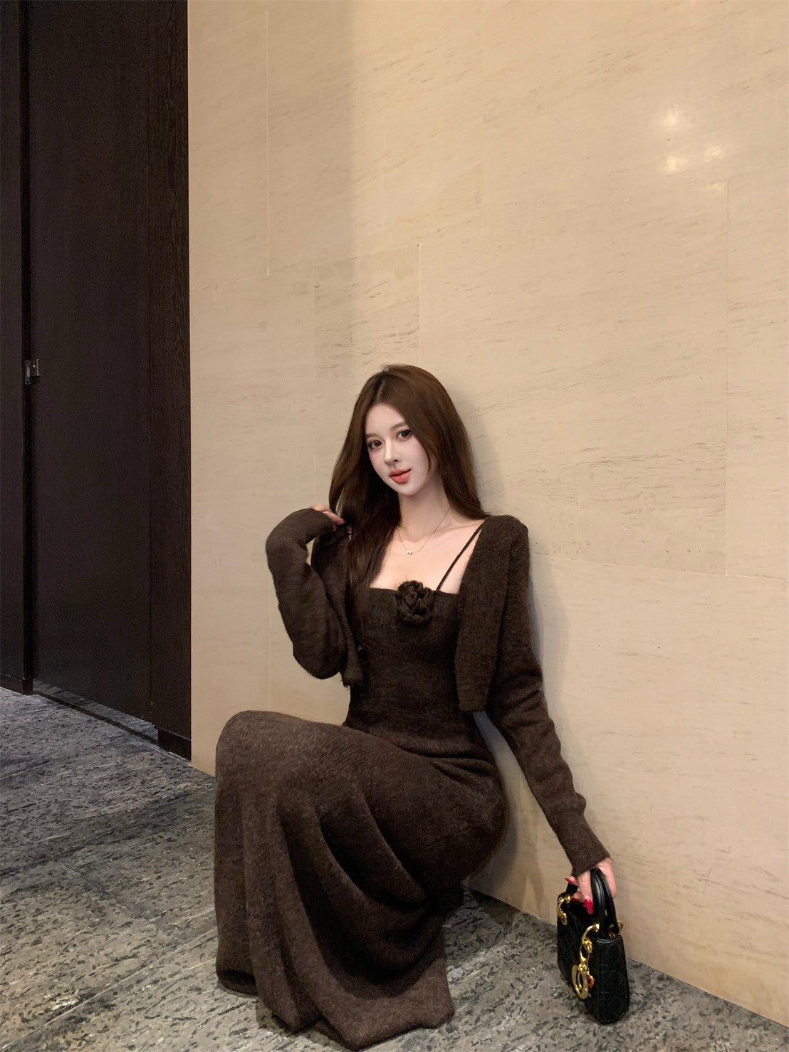 NA+ 輕熟摩卡厚針織抹胸裙 同色系短款外套