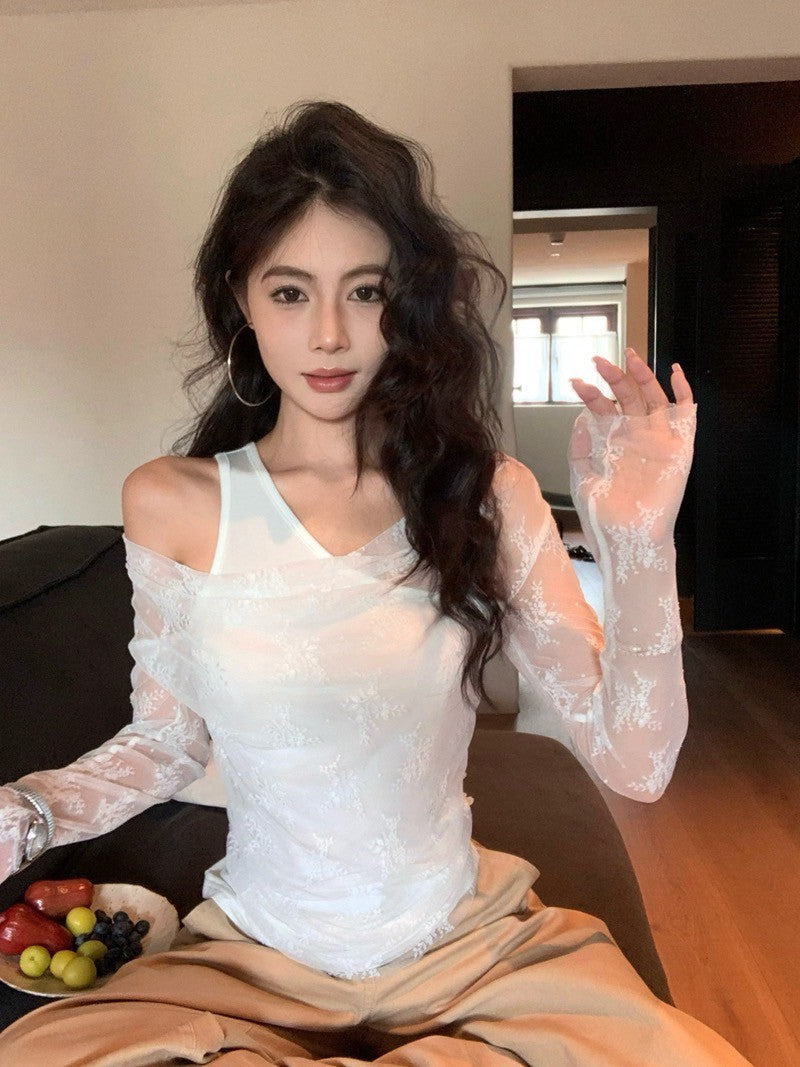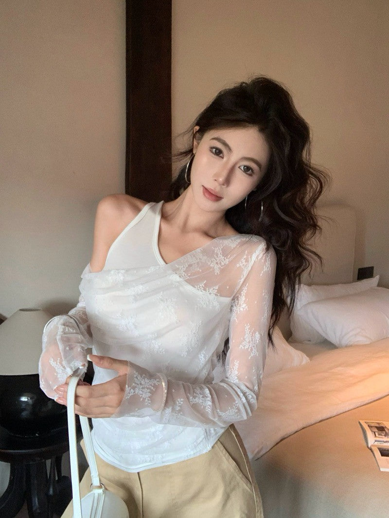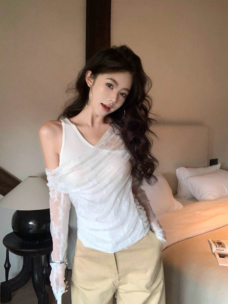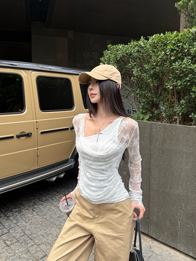 NA+ 造型偷心蕾絲假兩件式疊穿上衣 白