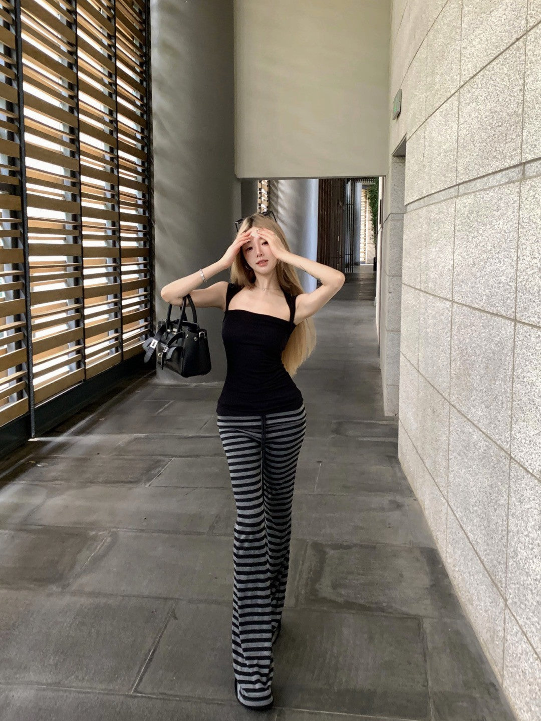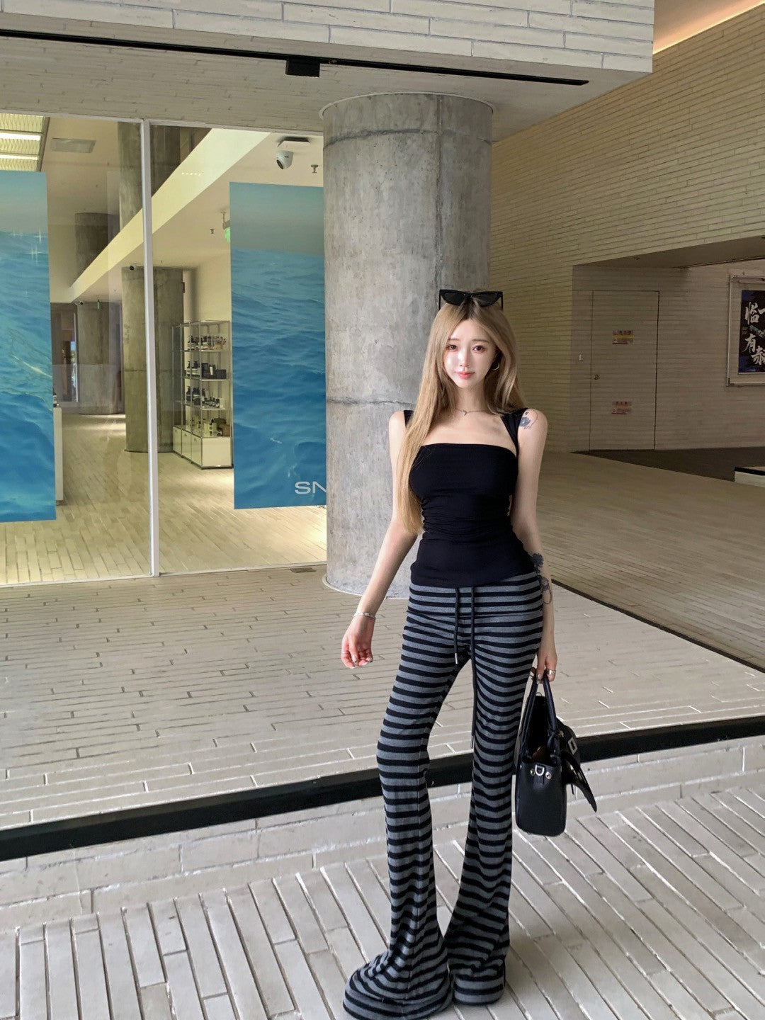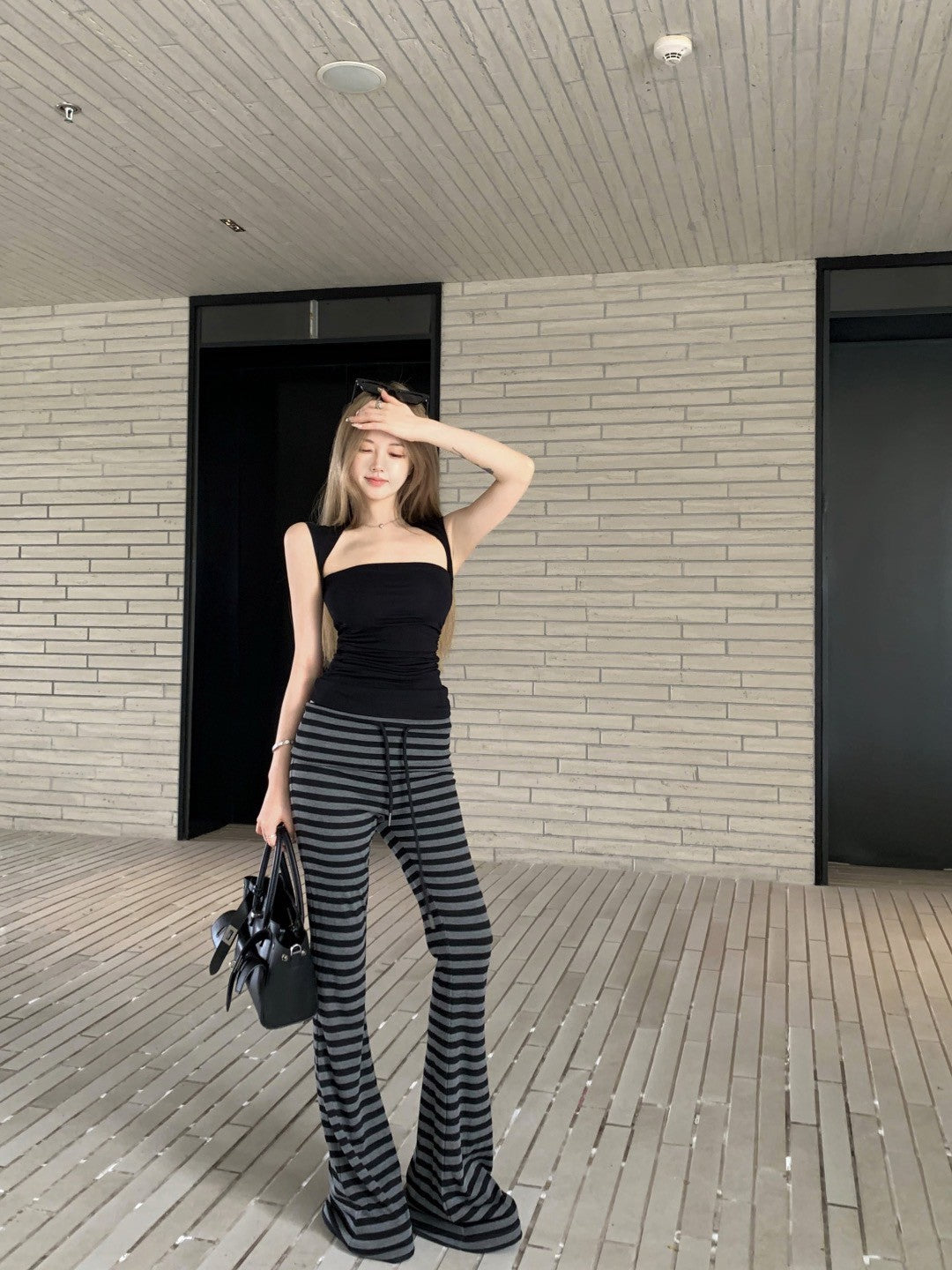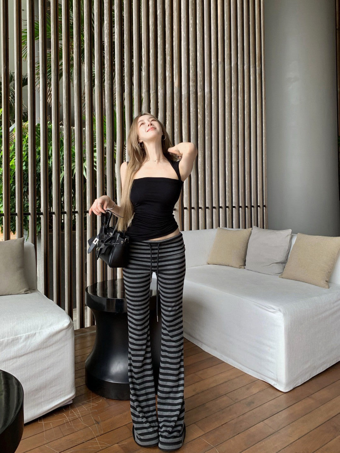 NA+ 運動瑜伽慢跑黑灰彈力休閒褲