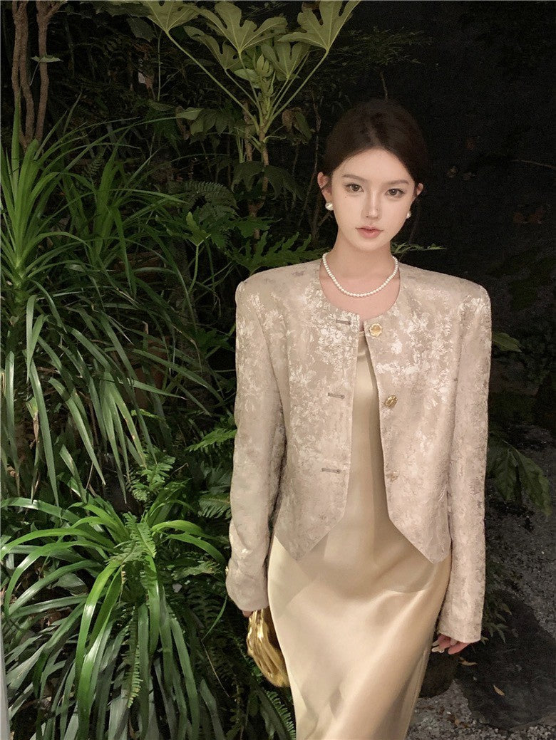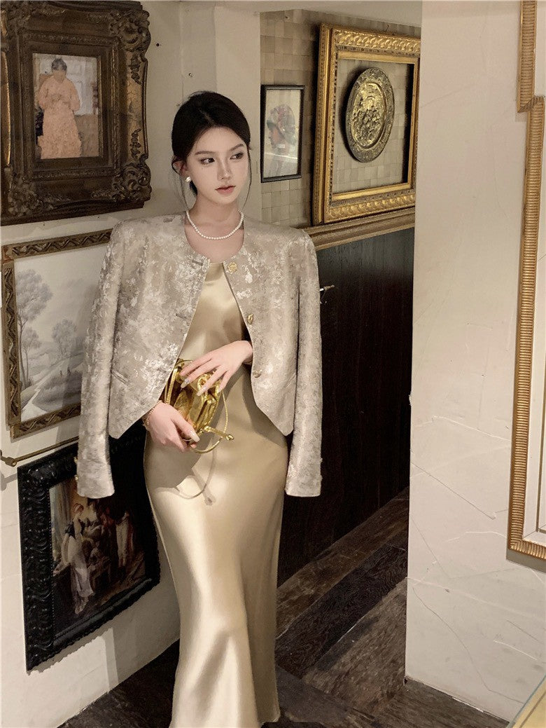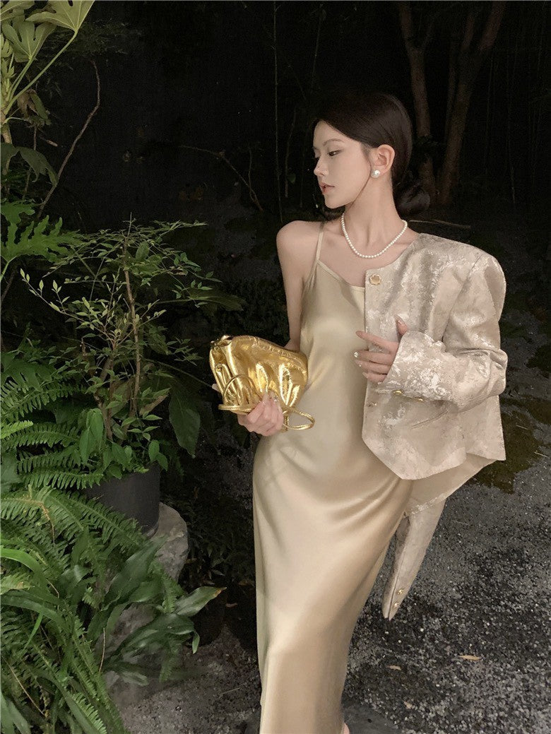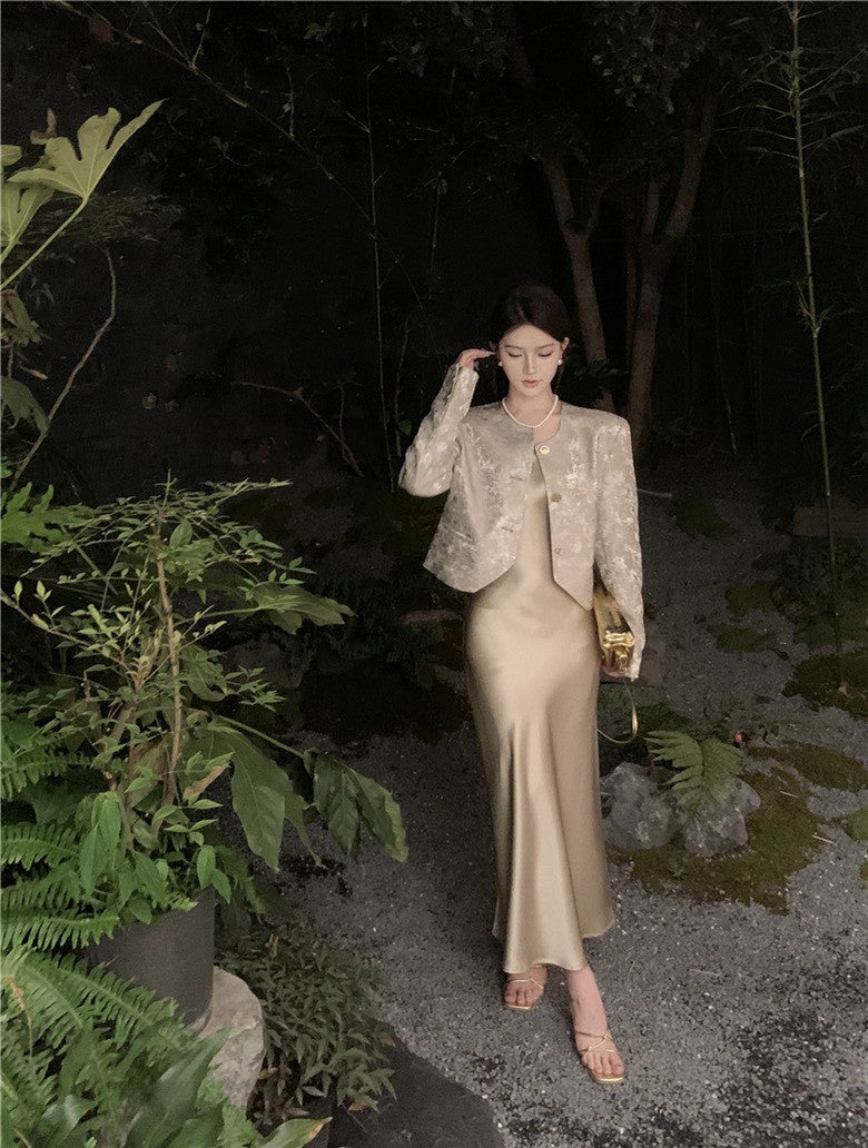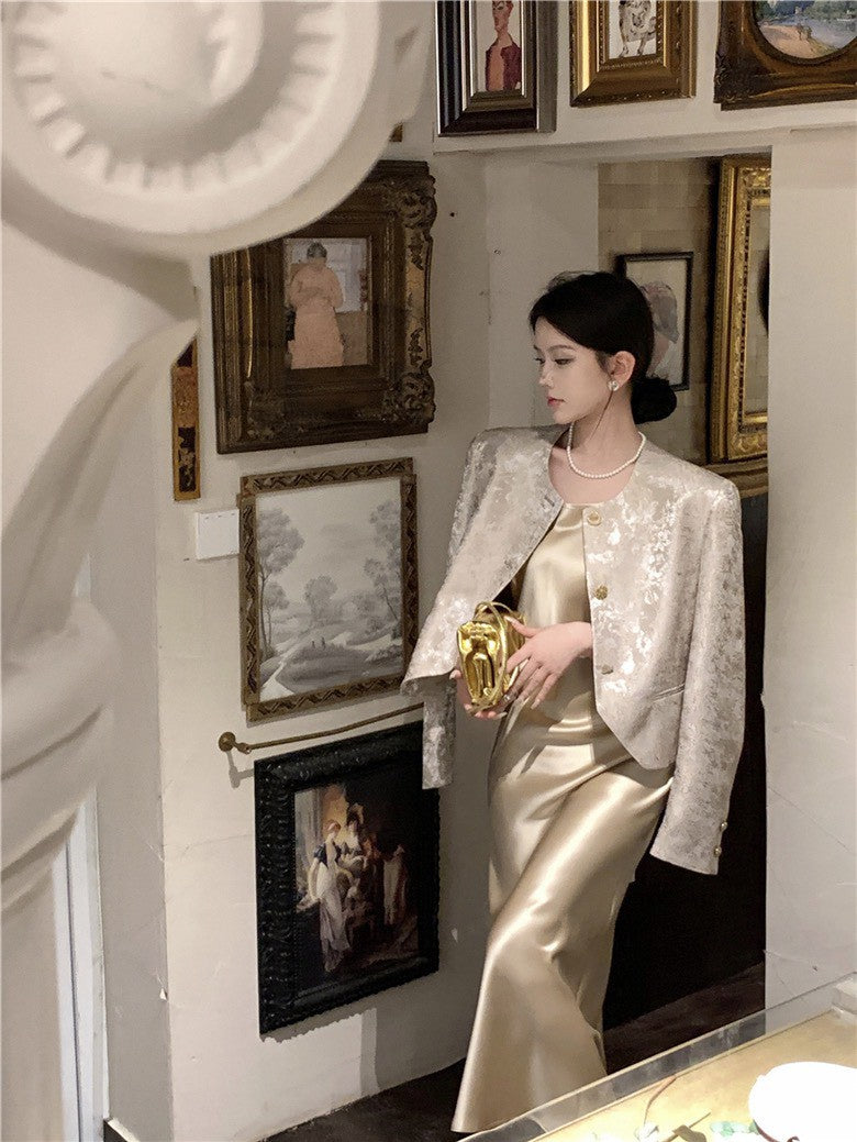 NA+ 鎏金緹花醋酸小香外套 緞感香檳連身裙