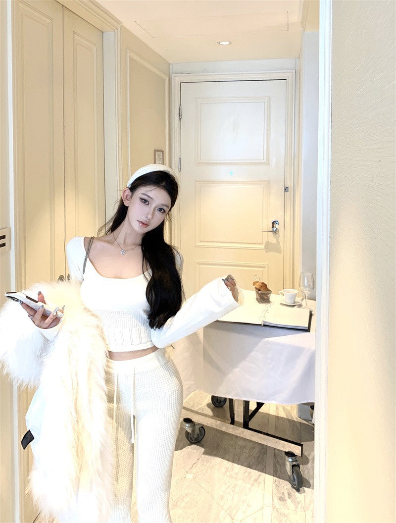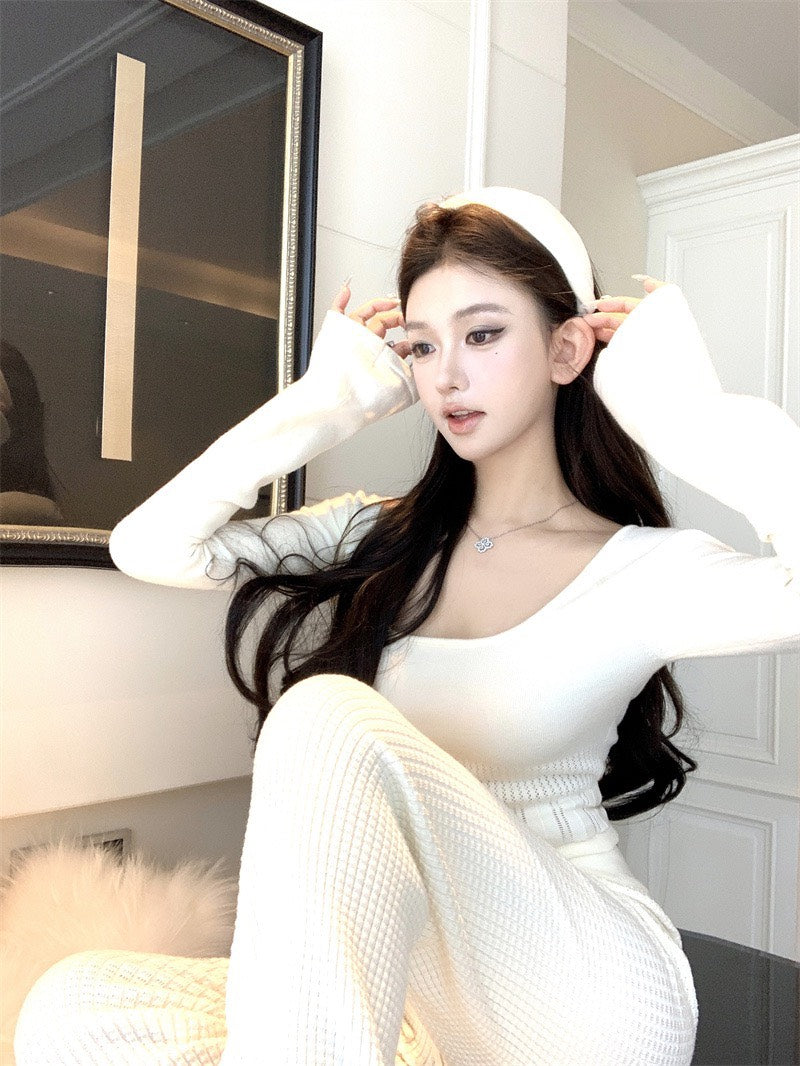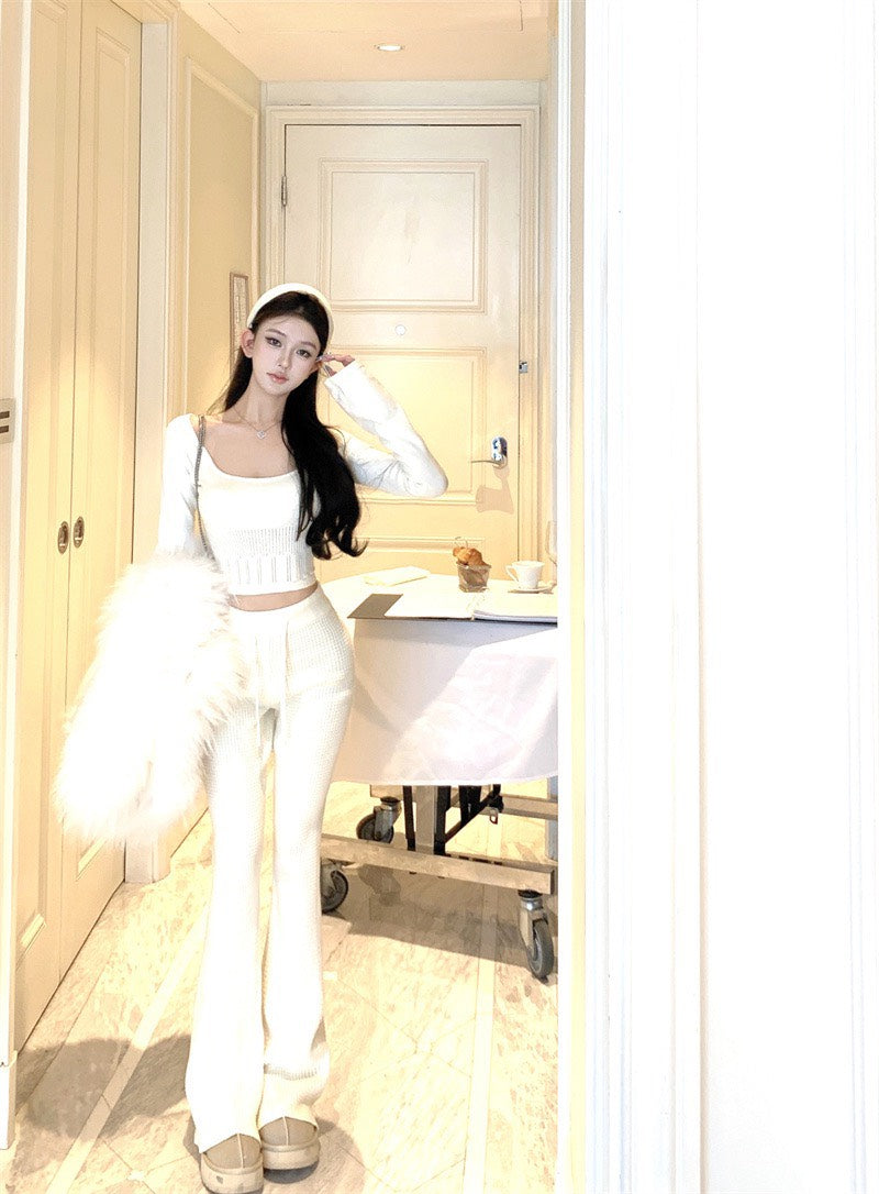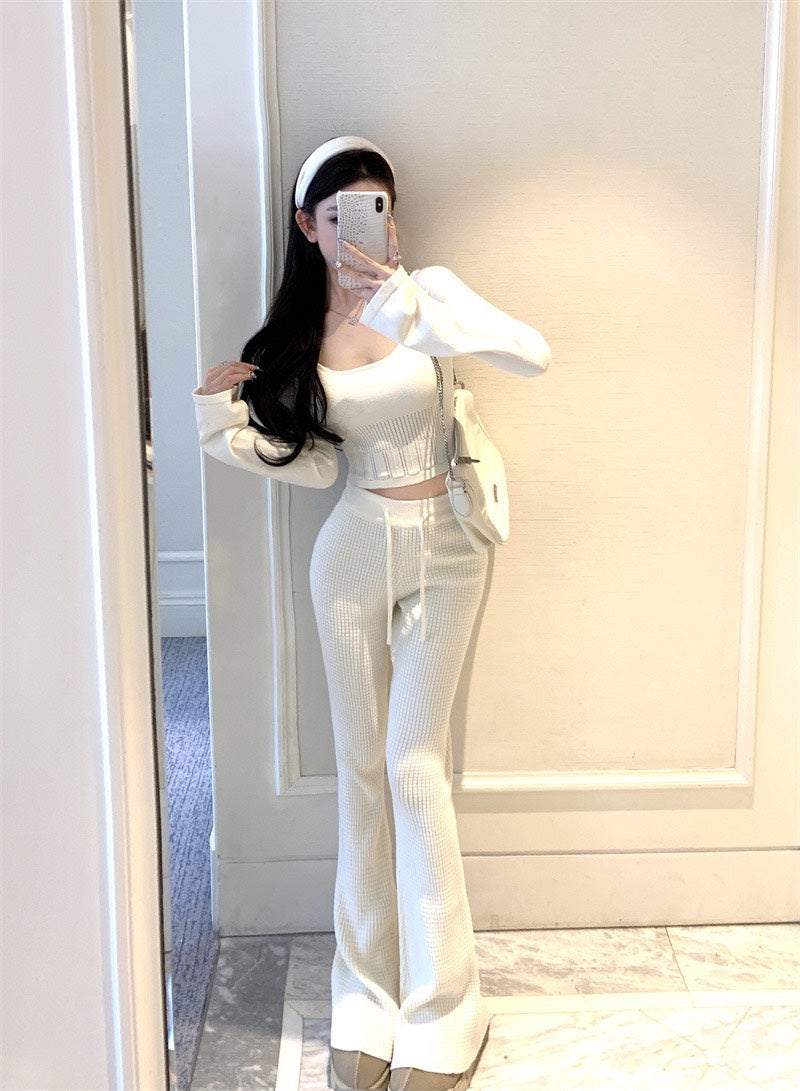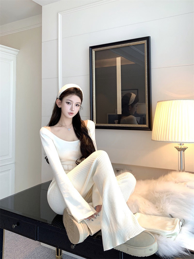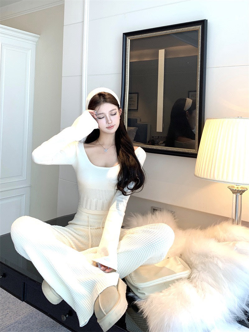 NA+ 韓系人 時髦針織修身喇叭袖上衣/休閒褲 杏