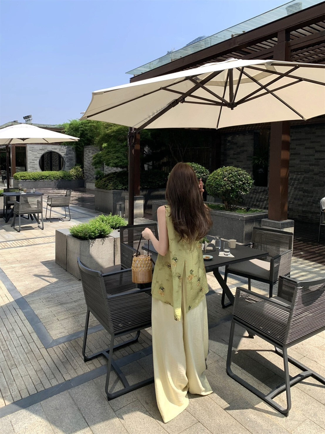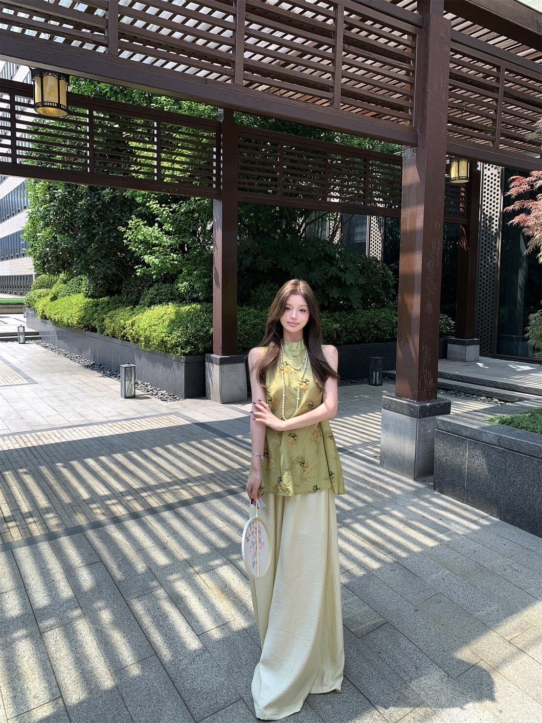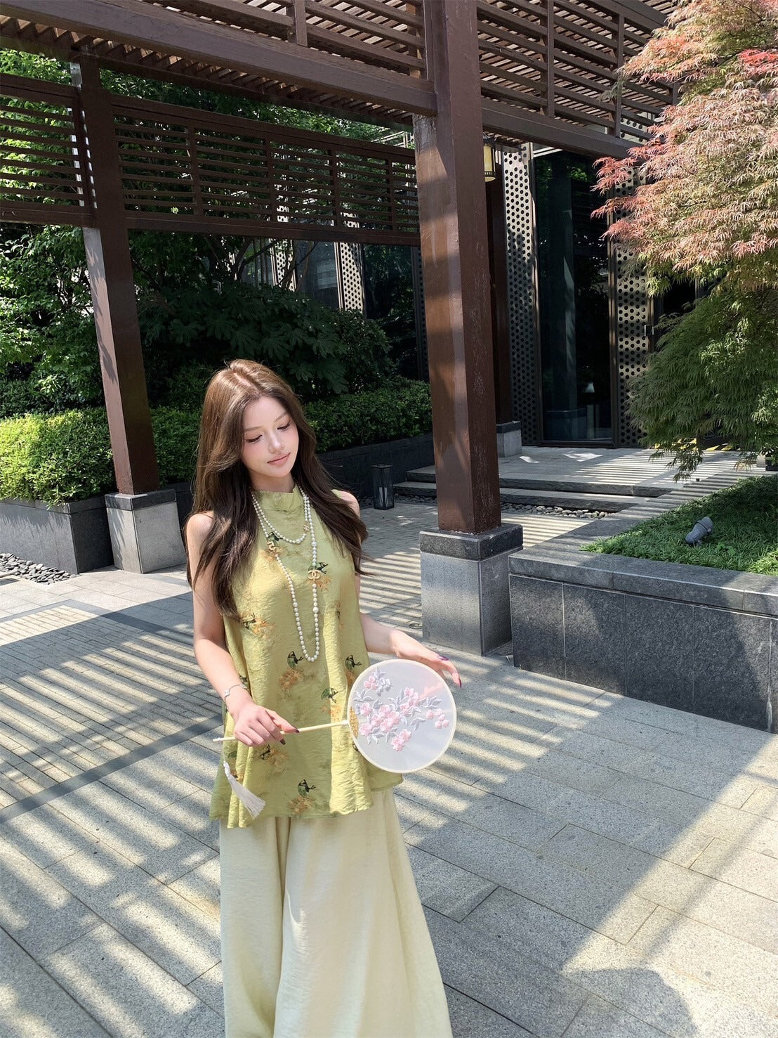 NA+ 飛花落葉 新中式提花背心/高腰闊腿褲