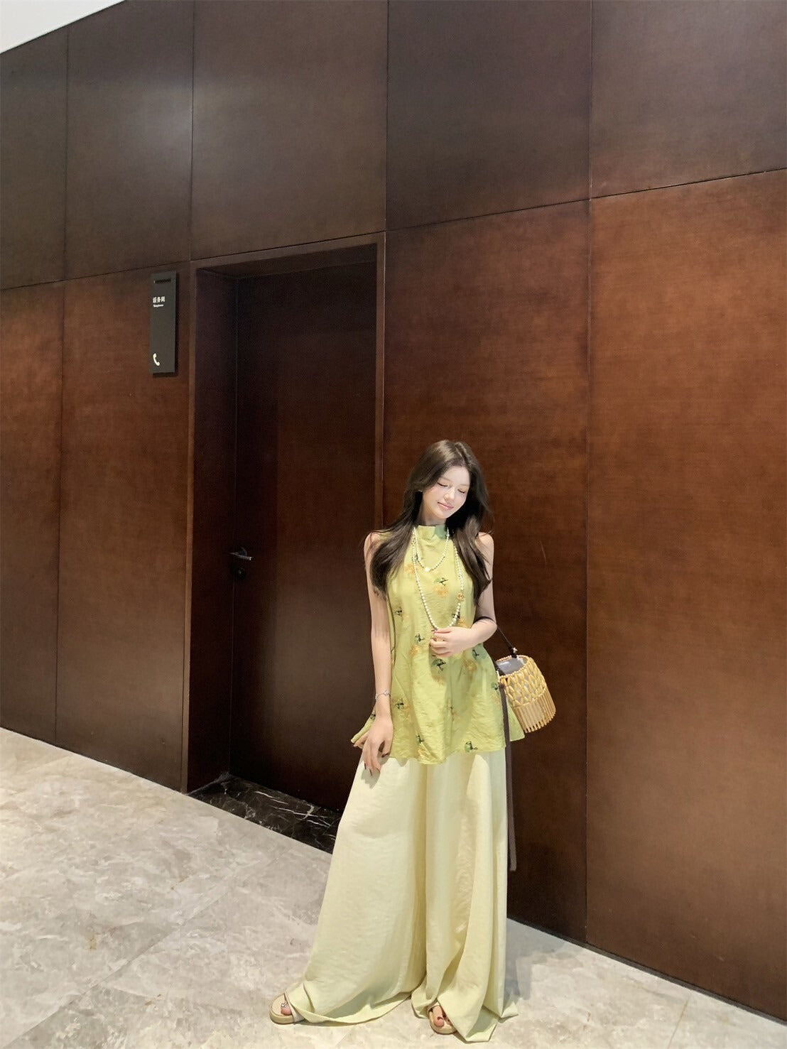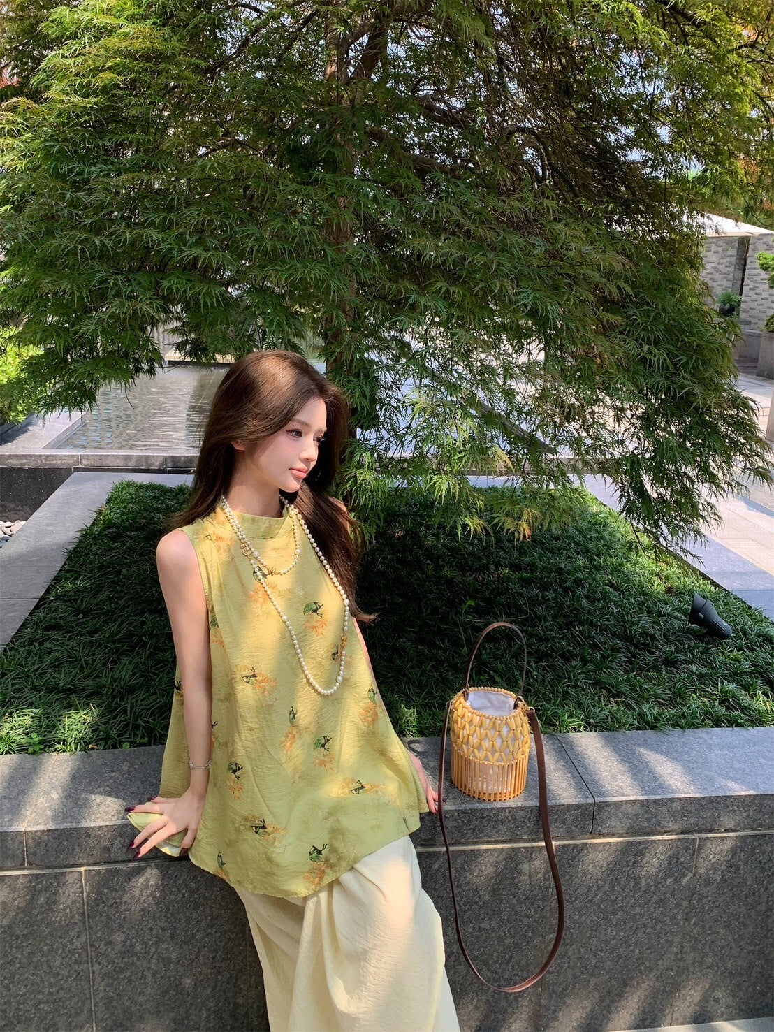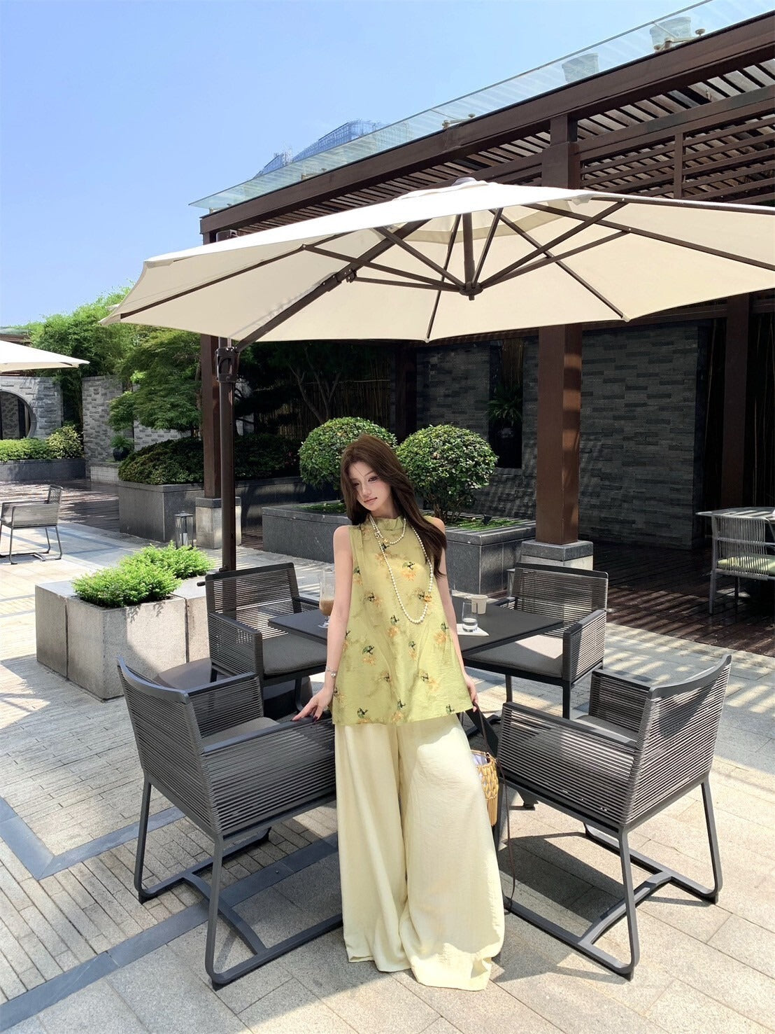 NA+ 飛花落葉 新中式提花背心/高腰闊腿褲