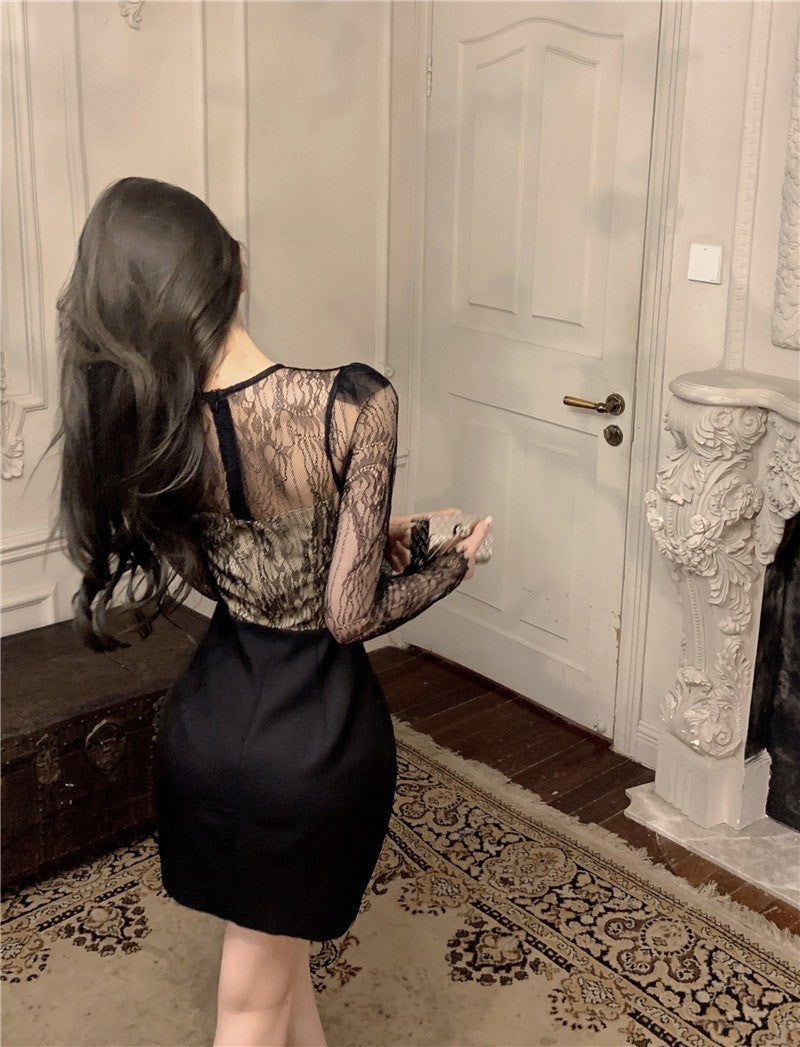 "Na+"貓女郎 法式蕾絲拼接氣質包臀裙 黑