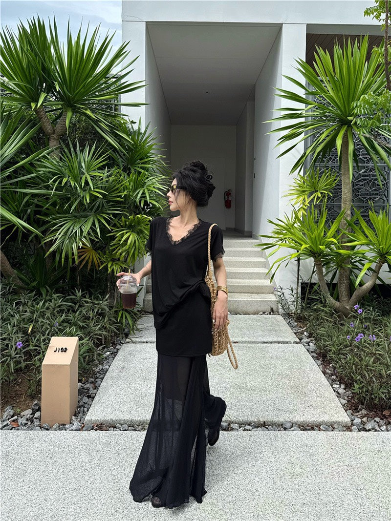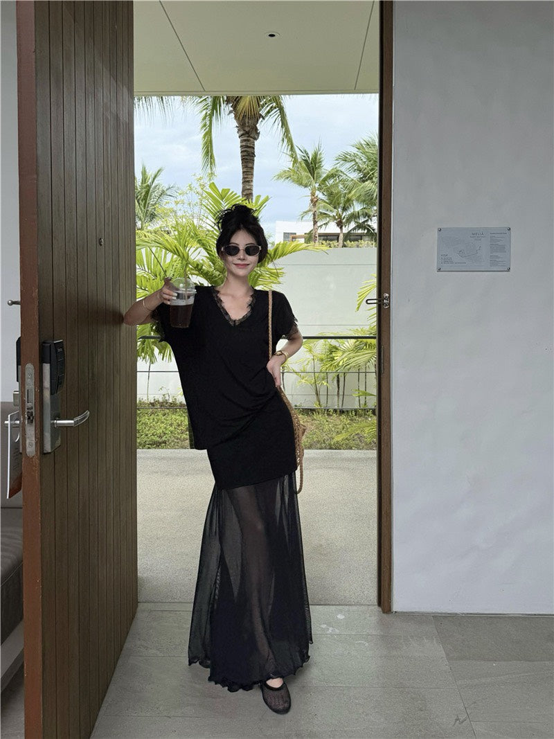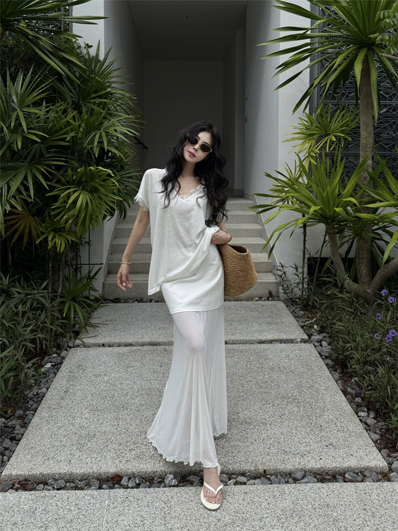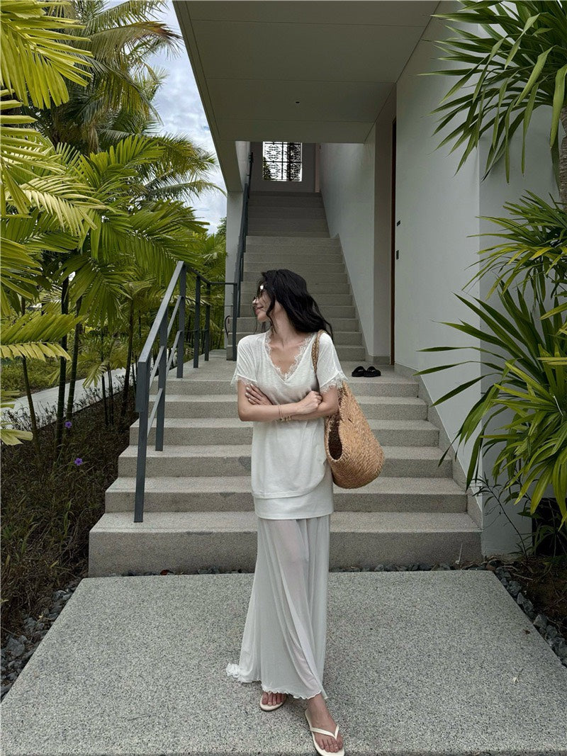 NA+ New money簡約蕾絲V領寬鬆上衣 透視拼接半身裙 白/黑